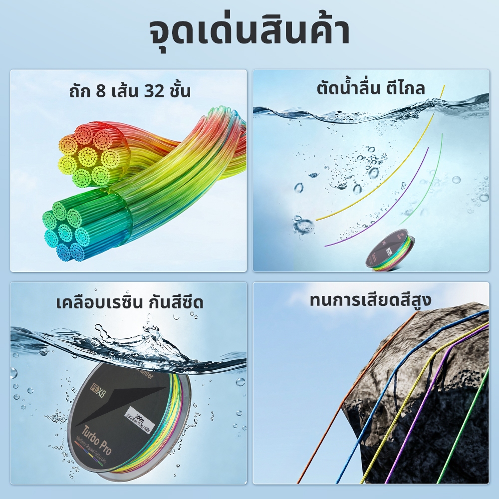 SeaHunter Turbo Pro สาย PE ถัก 8 เส้น หลากสี ยาว 300เมตร แรงดึง 7.8–41.8 กก. ลื่น แบ่งสีทุก 10 เมตร เหนียว ทนทาน