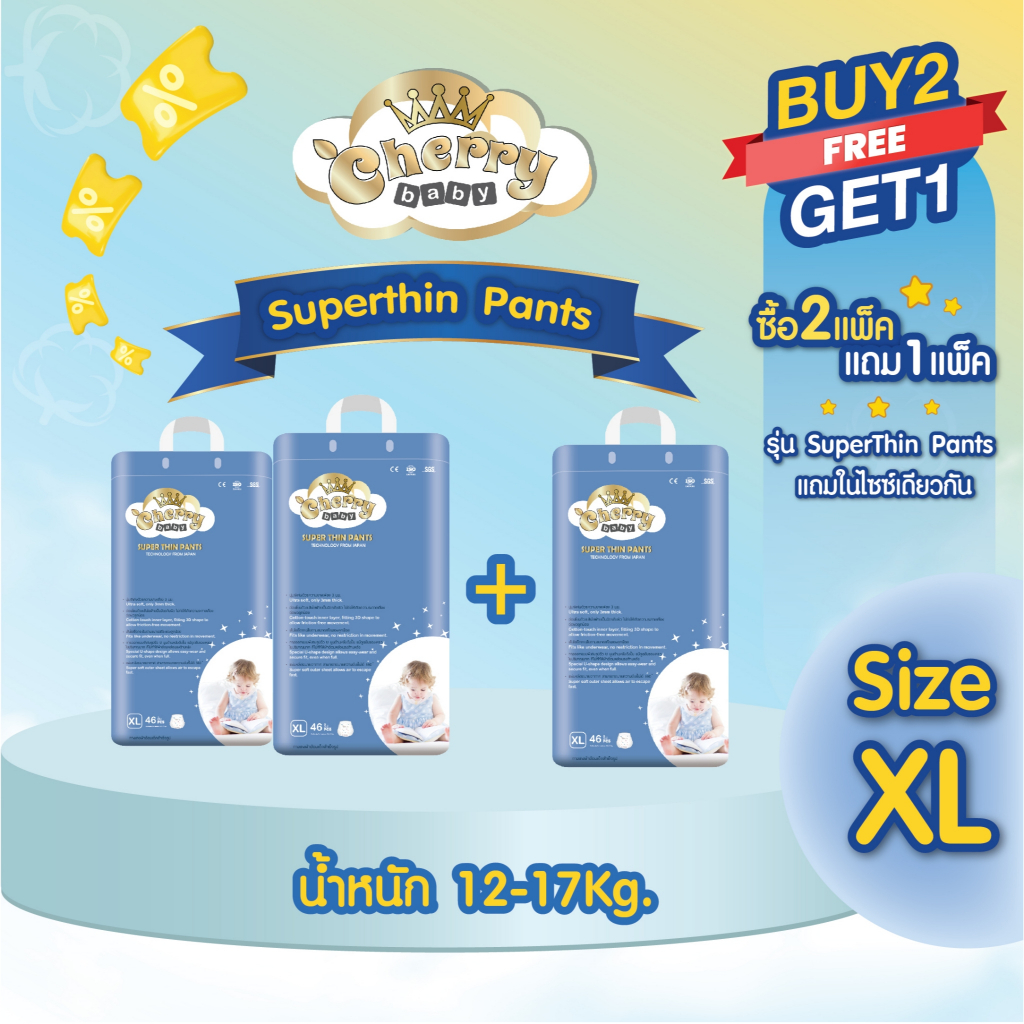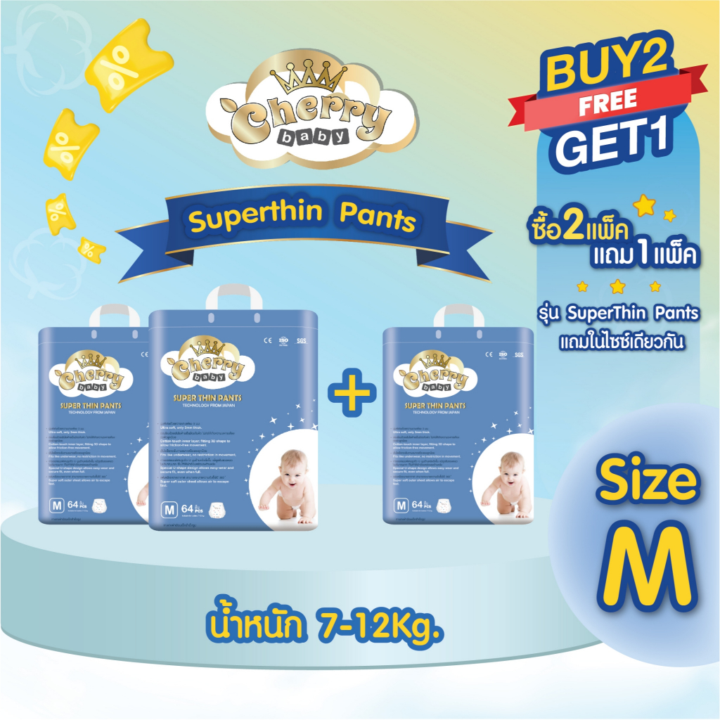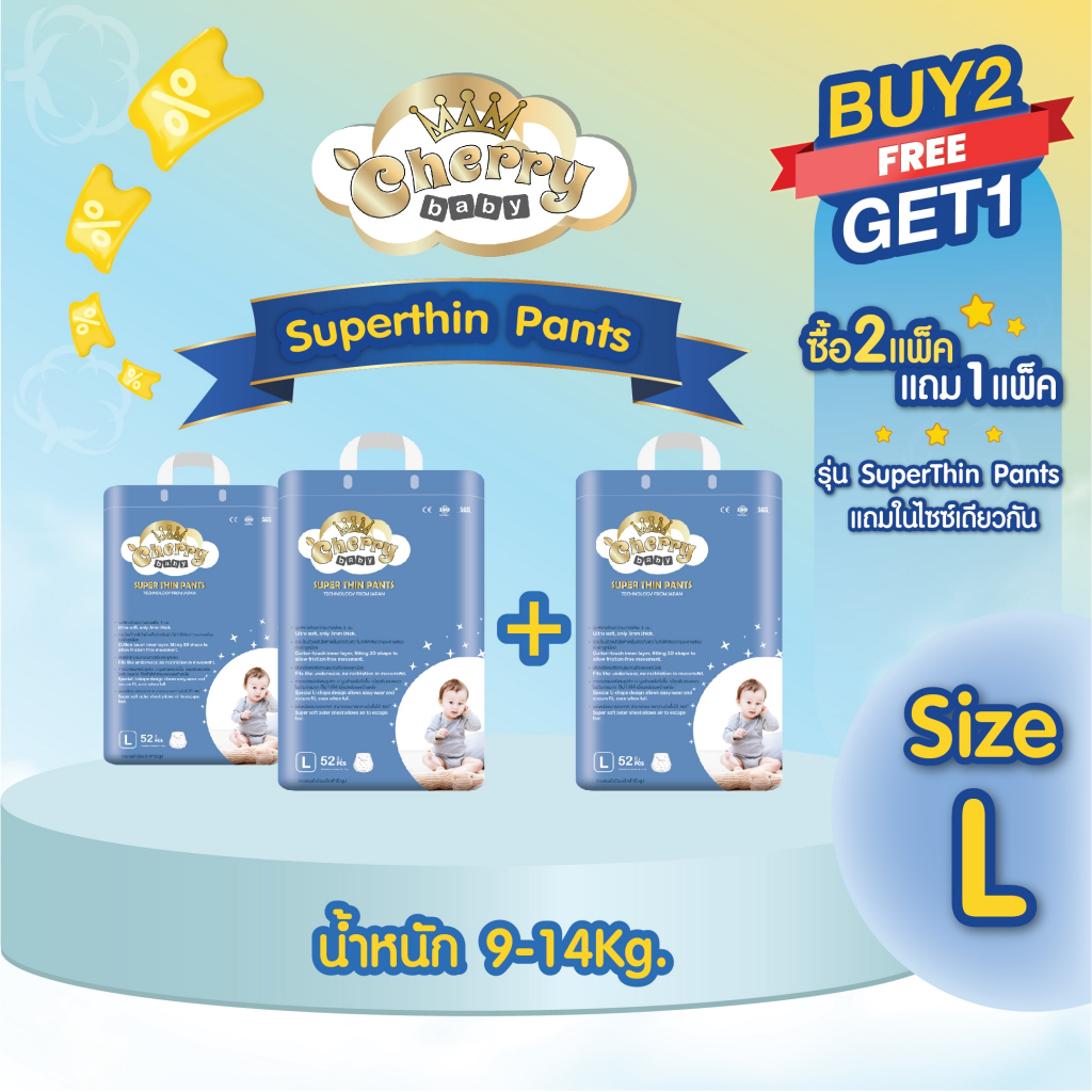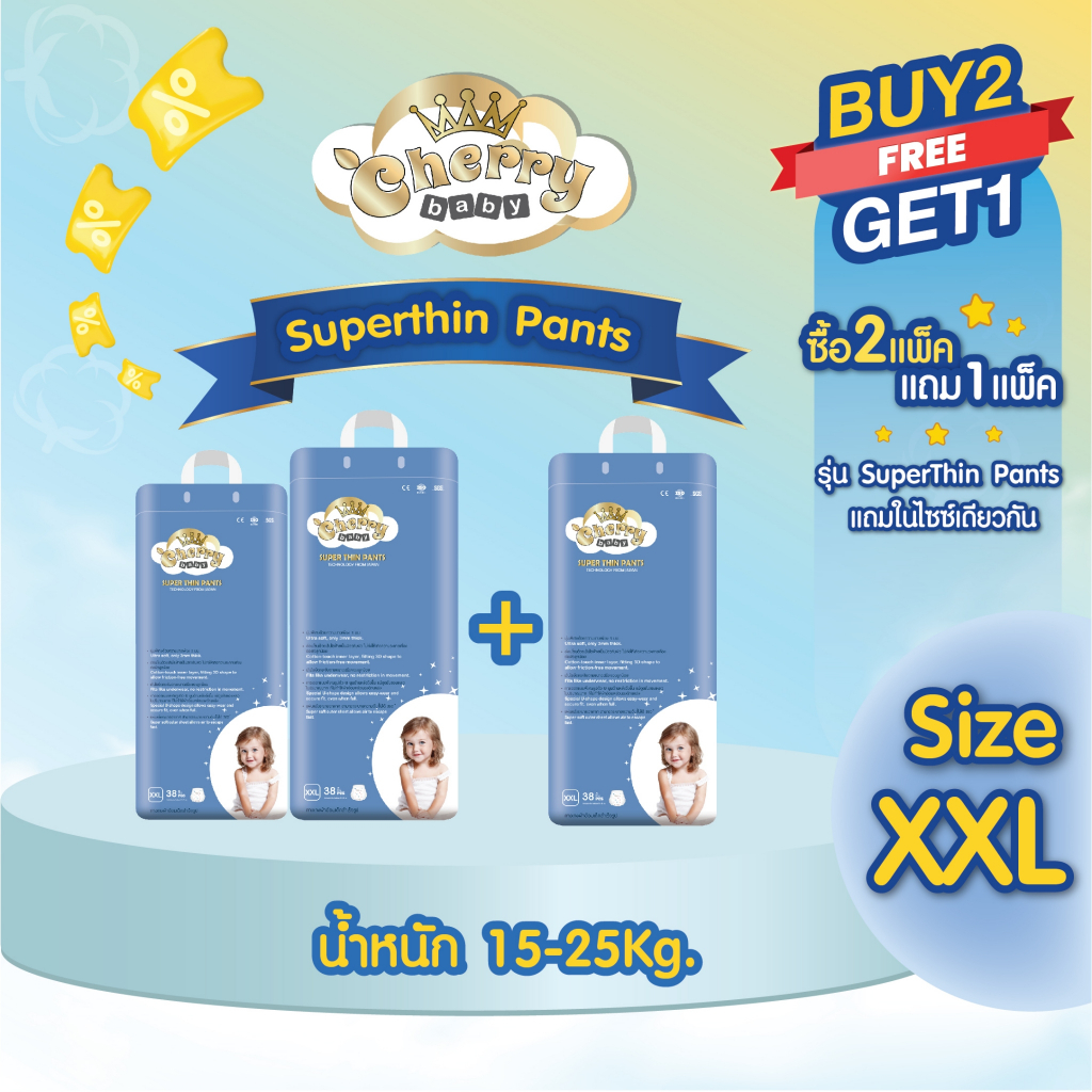[ 2 แถม 1 ] Cherry Baby รุ่น Premium ผ้าอ้อมเด็กสำเร็จรูป ไซส์ M , L , XL , XXL