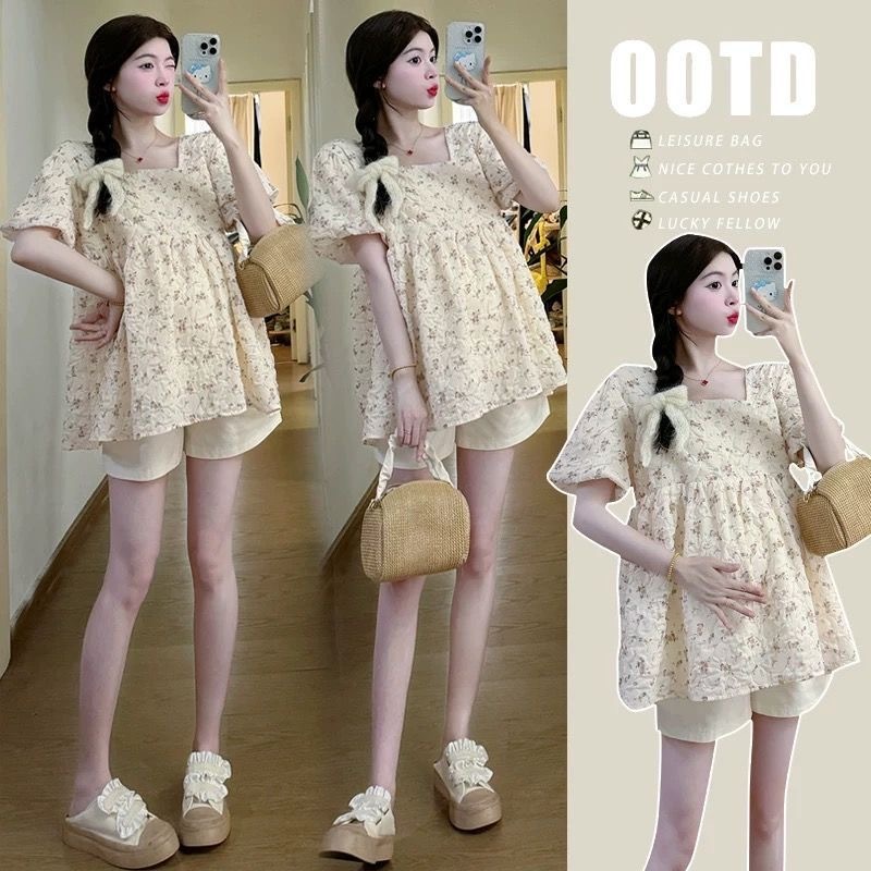 💏เสื้อผ้าคนท้องแฟชั่น🍑เสื้อแขนสั้นฟูฟ่องลายดอกไม้+กางเกงหลวมหน้าท้อง⭐️ชุดคนท้องน่ารัก ใส่สบาย M-2XL