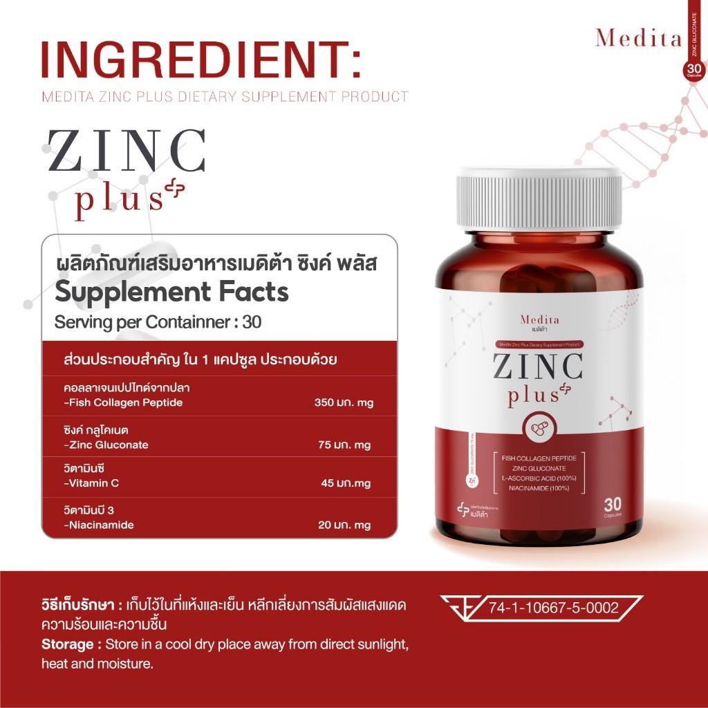 [ 2 ซอง ] สูตรใหม่ MEDITA ZINC PLUS Vitamin C+ Collagen เมดิต้า ซิงค์ พลัส 30 แคปซูล
