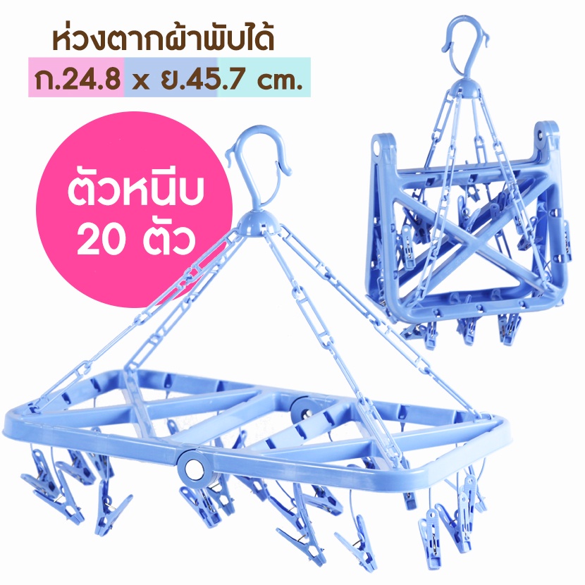 ห่วงตากผ้าพลาสติก ทรงเหลี่ยม แบบพับได้ Size L / ตัวหนีบ 20 ตัว (No.230)