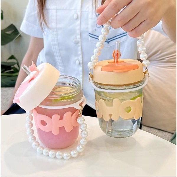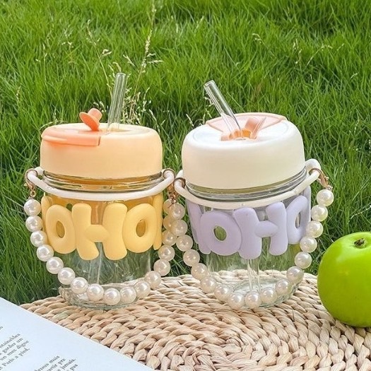 แก้วกาแฟ ใส่น้ำ พร้อมหลอดแก้ว หูหิ้วสร้อยไข่มุก 350ML(0001)