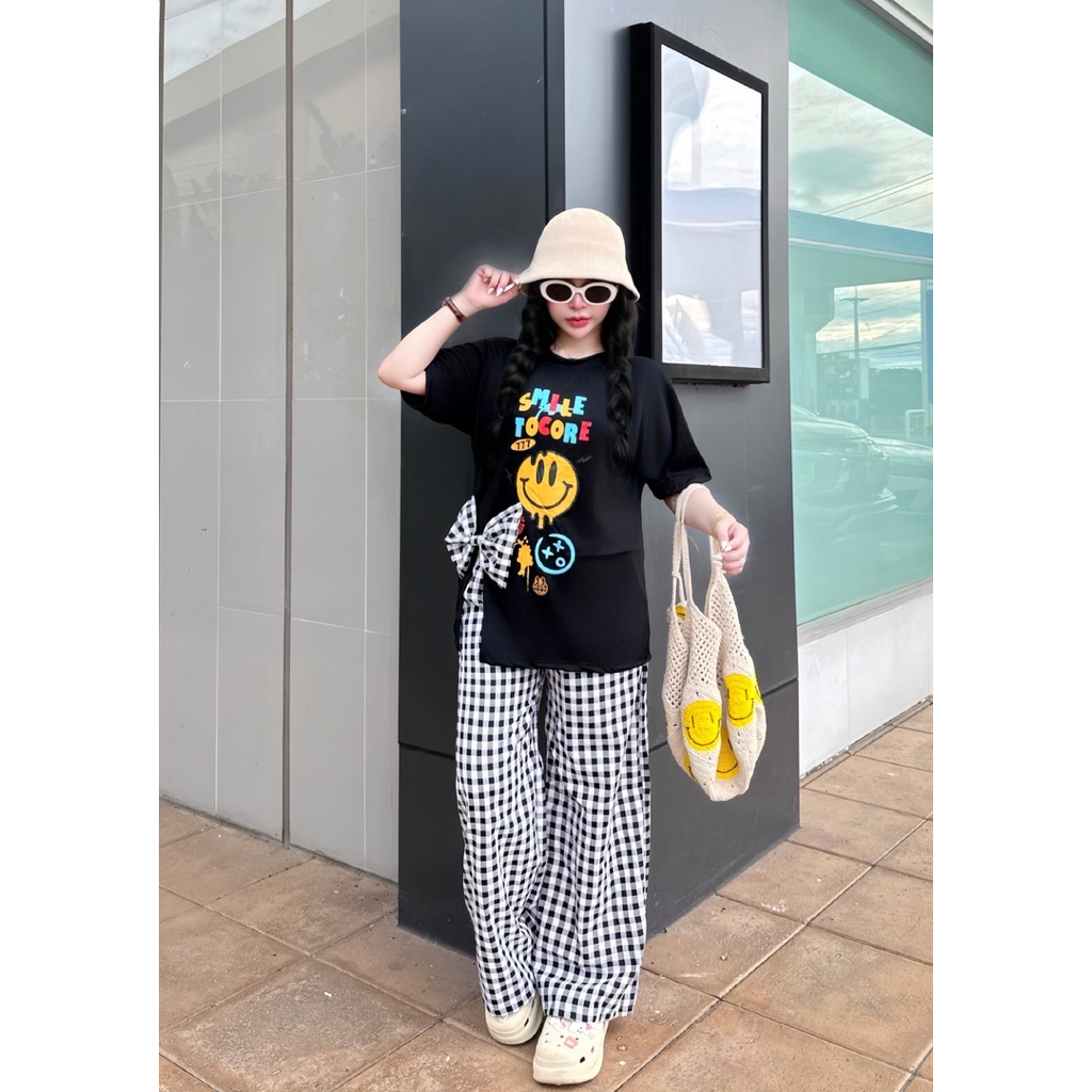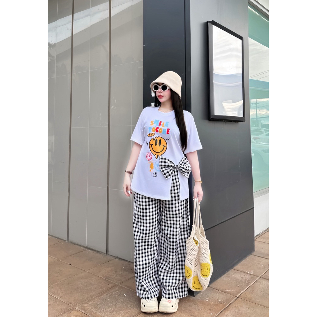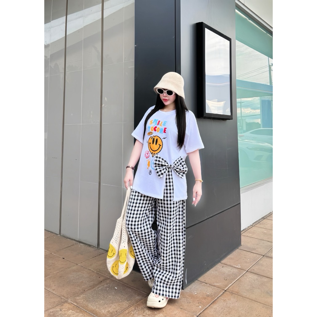 ชุด2 ชิ้นผ่าข้าง แต่งโบว์ ลายยิ้ม กางเกงสก๊อต งานโอเวอร์ไซร์ s m l xl ใส่ได้จ้า