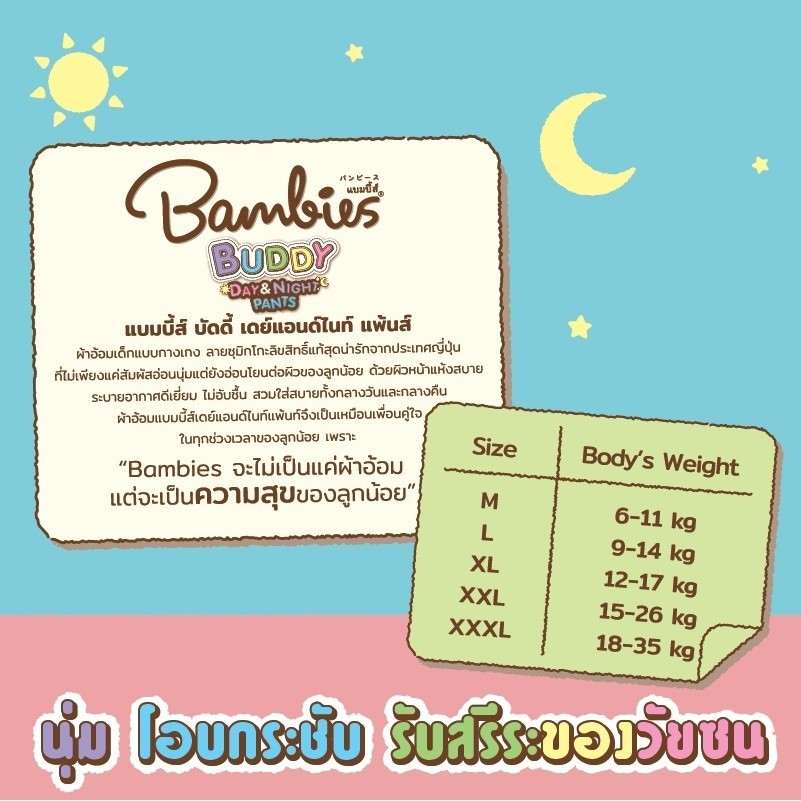 Bambies แบมบี้ส์ ผ้าอ้อม แบบกางเกง แพมเพิส รุ่น Buddy Day&Night ยกลัง 3 ห่อใหญ่ มีให้เลือกครบทุกไซส์