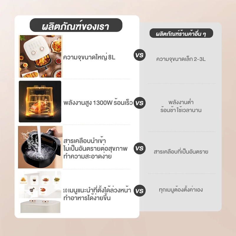 Air fryer หม้อทอดไร้น้ำมัน อเนกประสงค์ ความจุขนาดใหญ่ 8 ลิตร หน้าต่างโปร่งใส 10 ฟังก์ชั่นเมนู ทำความสะอาดง่าย