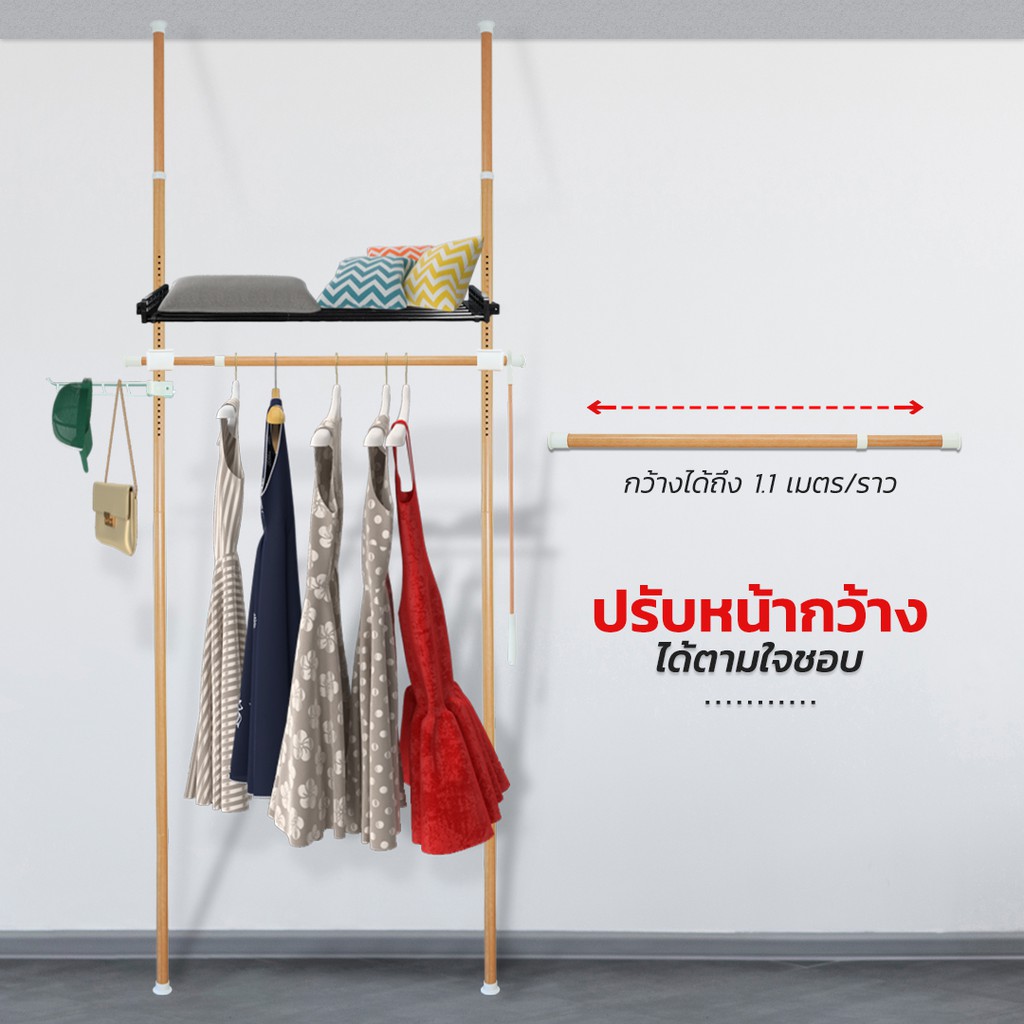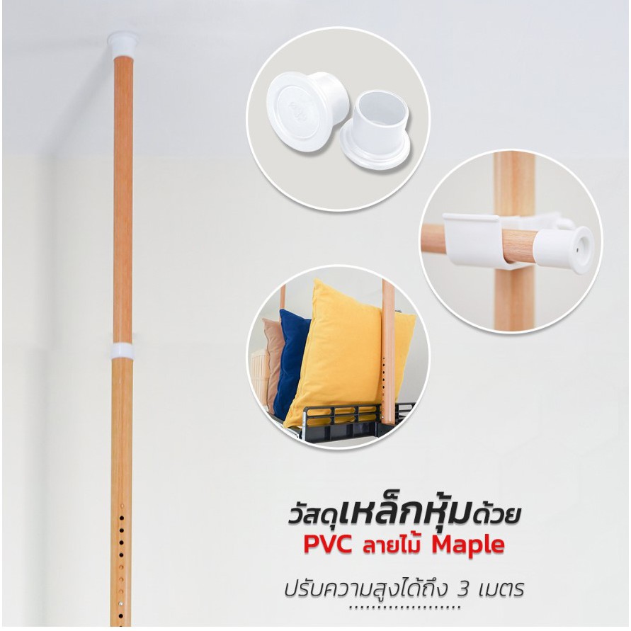TUGU ชุด 6 ราวแขวน 3 ชั้นวาง ราวแขวนไม่ต้องเจาะ แถมฟรีวิงแขวนและไม้สอย ลายไม้ (R25M)