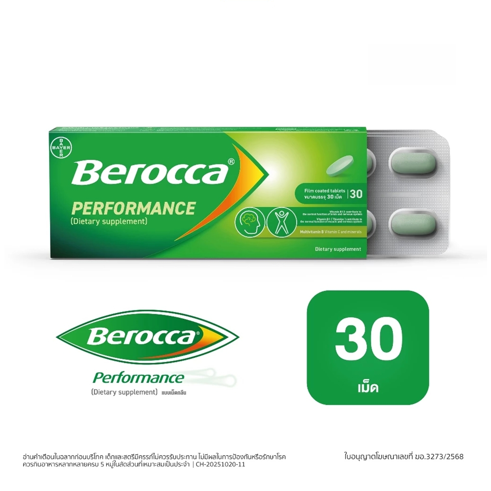 แบบเม็ดกลืน30เม็ด Berocca performance บีรอคคา เพอร์ฟอร์มานซ์ แบบเม็ดกลืน วิตามินบีรวม ผลิตภัณฑ์เสริมอาหาร กล่อง 30 เม็ด