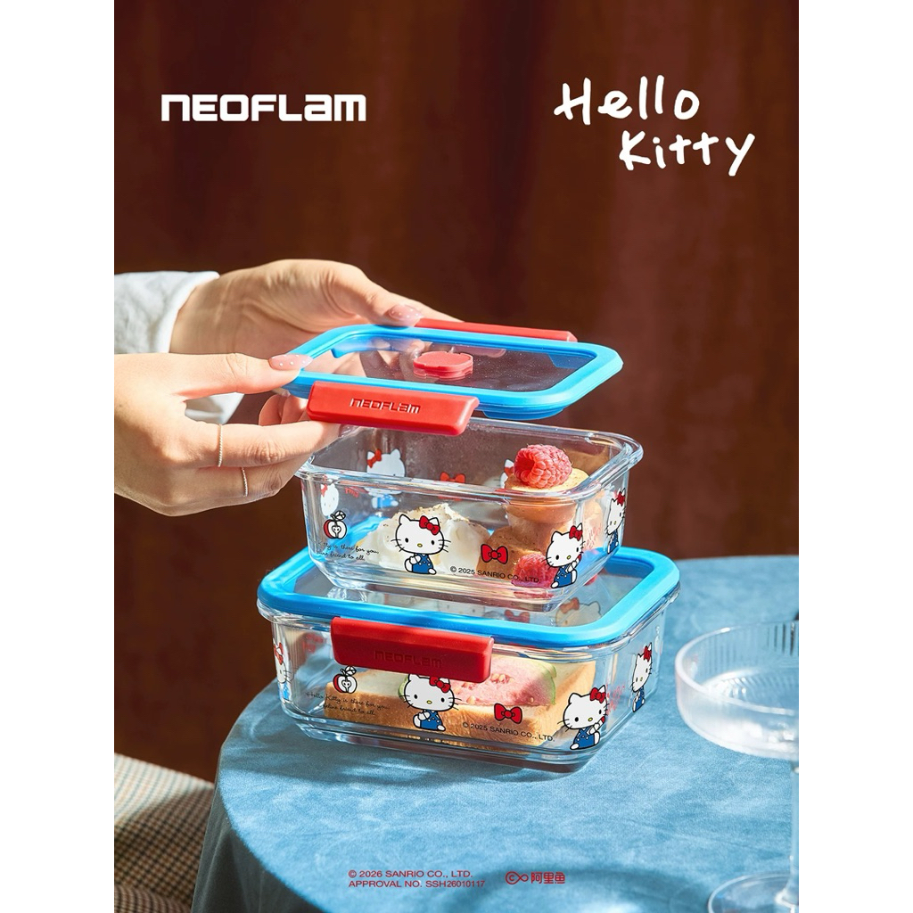 <พร้อมส่ง23/04 🔥> Neoflam x Hello Hitty กล่องเนื้อแก้ว ลายคิตตี้ ฝาปิดแน่น กระเป๋าเก็บอุณหภูมิ รุ่นสีแดง-ฟ้า