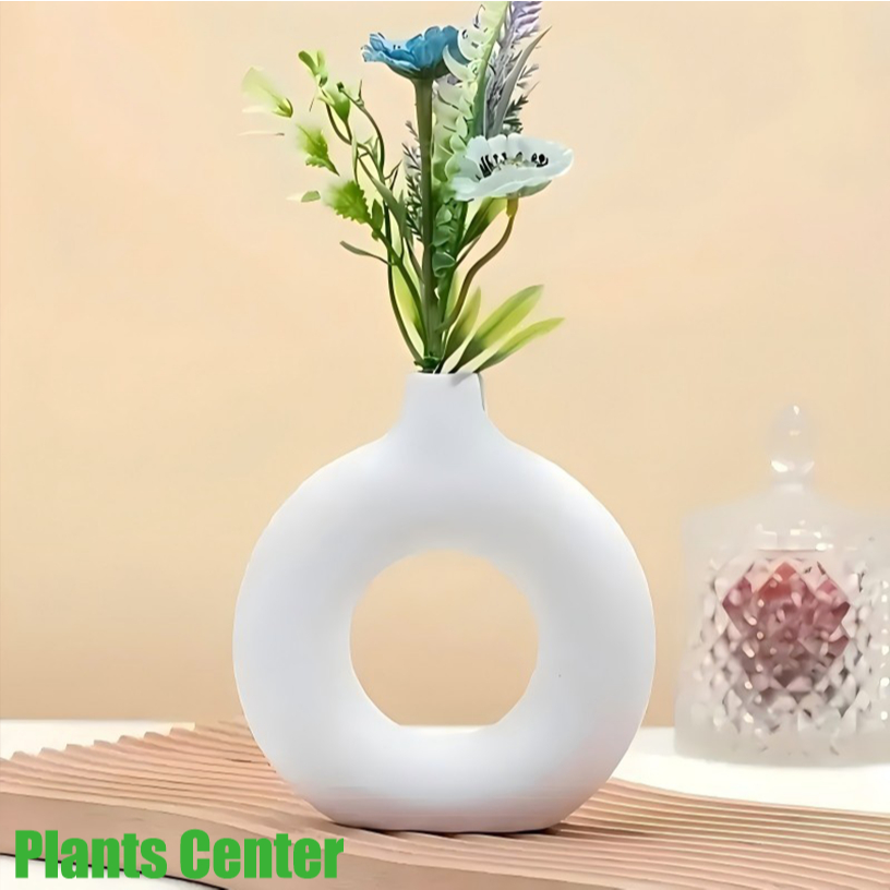 PlantsCenter T057 แจกันดอกไม้สีขาว สไตล์นอร์ดิก ทรงโดนัท วัสดุพลาสติกจำลองเซรามิก ดีไซน์สวย แข็งแรง