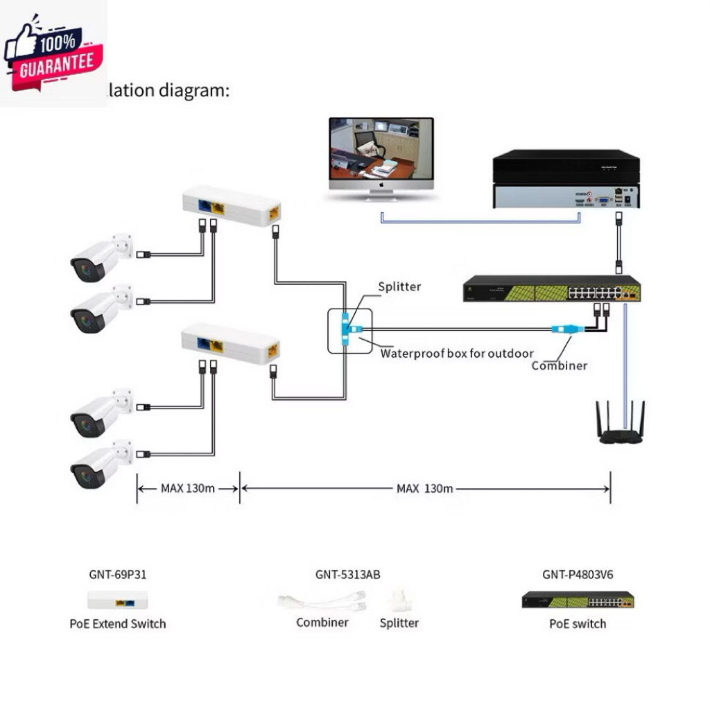 ตัวแยก POE 1 OUT 2 1SE+2EP 1 เส้นเดินกล้องเพิ่มได้ 3-4 ตัว ระยะส่ง 400M