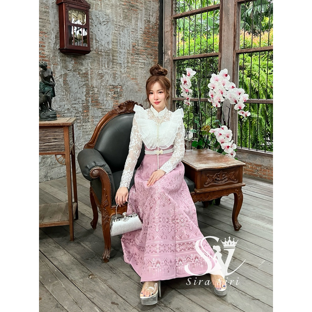 Sira Siri ชุดไทย ชุดเจ้าสาว ชุดลูกไม้ เสื้อลูกไม้ปักลายดอกยกนูน แต่งระบายวีเชฟ ผ้าถุงสำเร็จรูปทอลายตัดเย็บละเอียดทั้งชุด