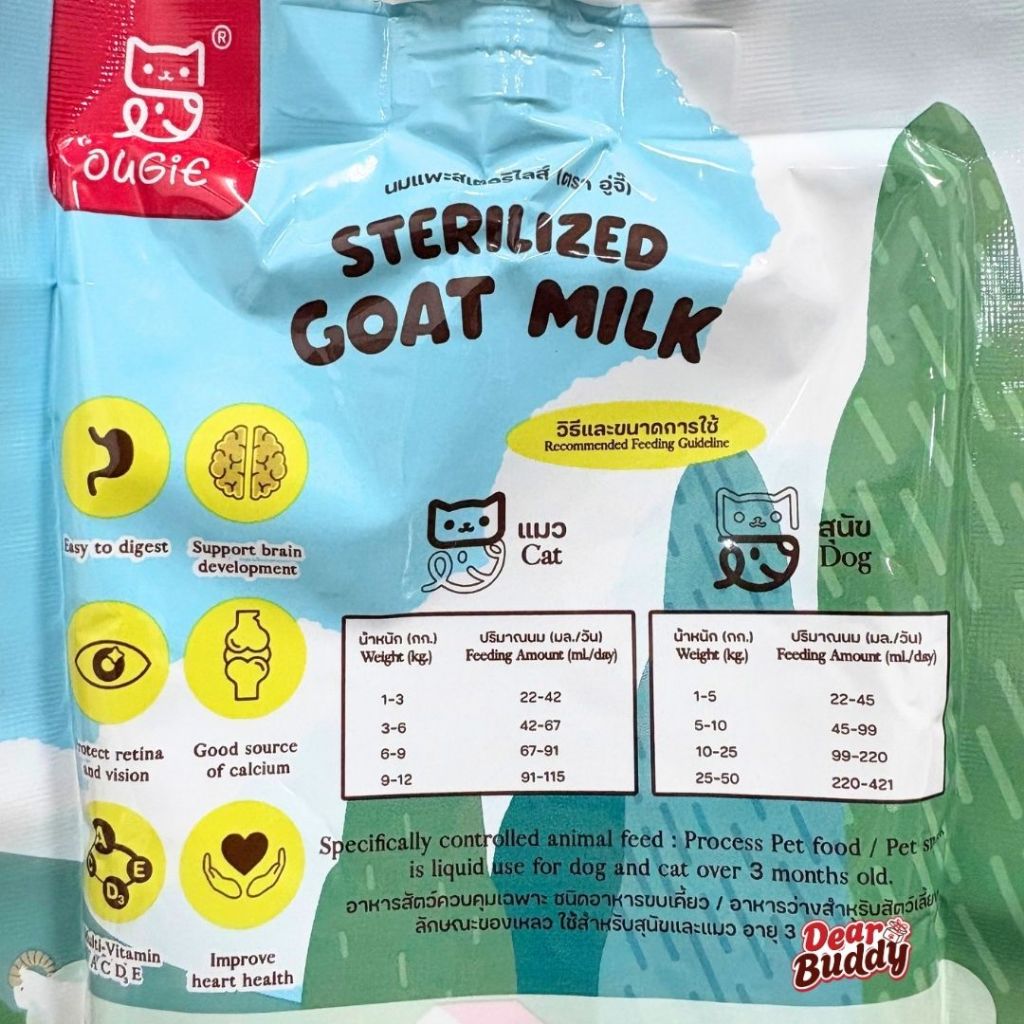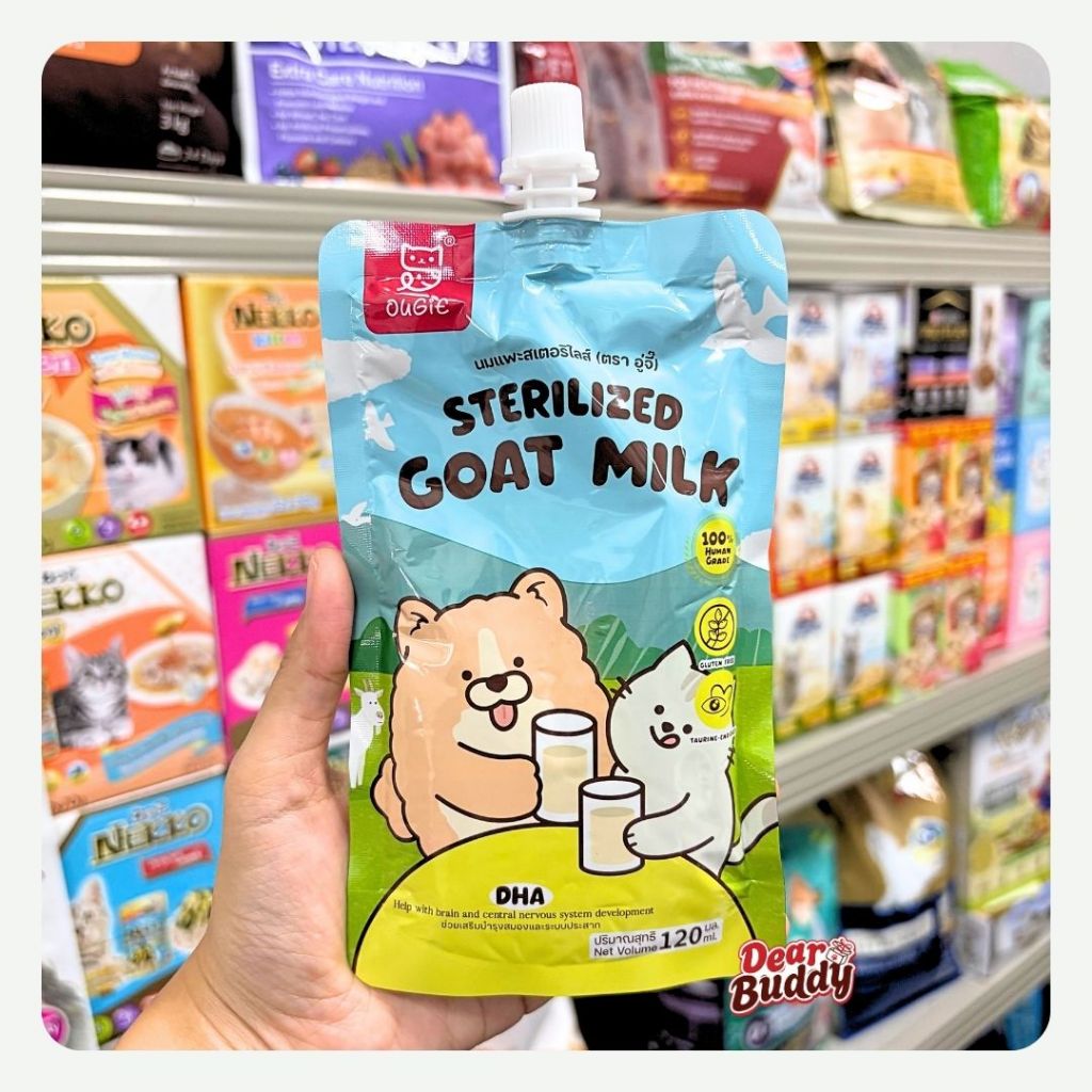 นมแพะสเตอริไลส์ 120ml x6 ซองใหญ่ อู่จี๊(Ougie) ผสมทอรีน สำหรับลูกสุนัขและลูกแมว ย่อยง่ายบำรุงร่างกาย