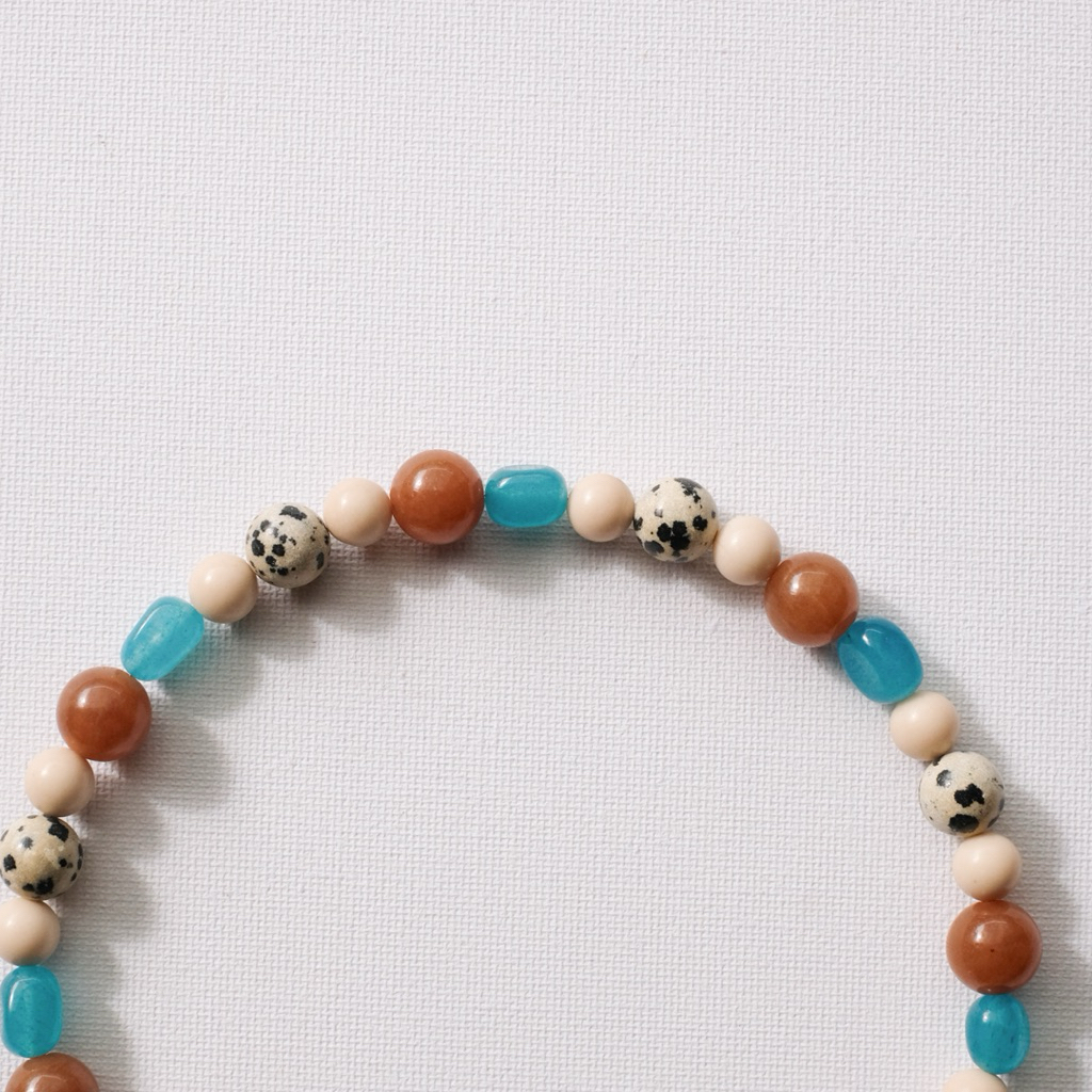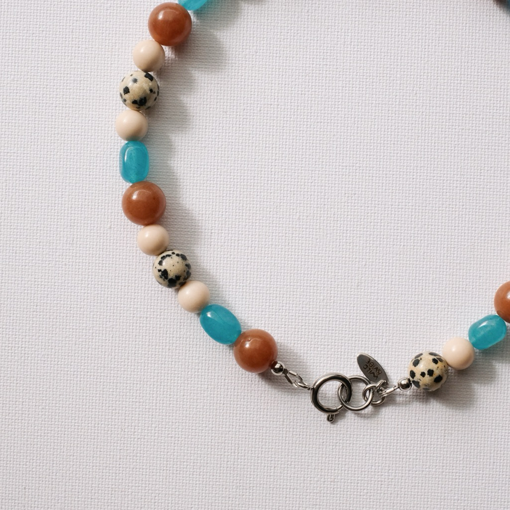 สร้อยลูกปัดหินแท้ผสมโทนฟ้าน้ำตาล– Dalmatian Jasper, Brown Aventurine, Aquamarine