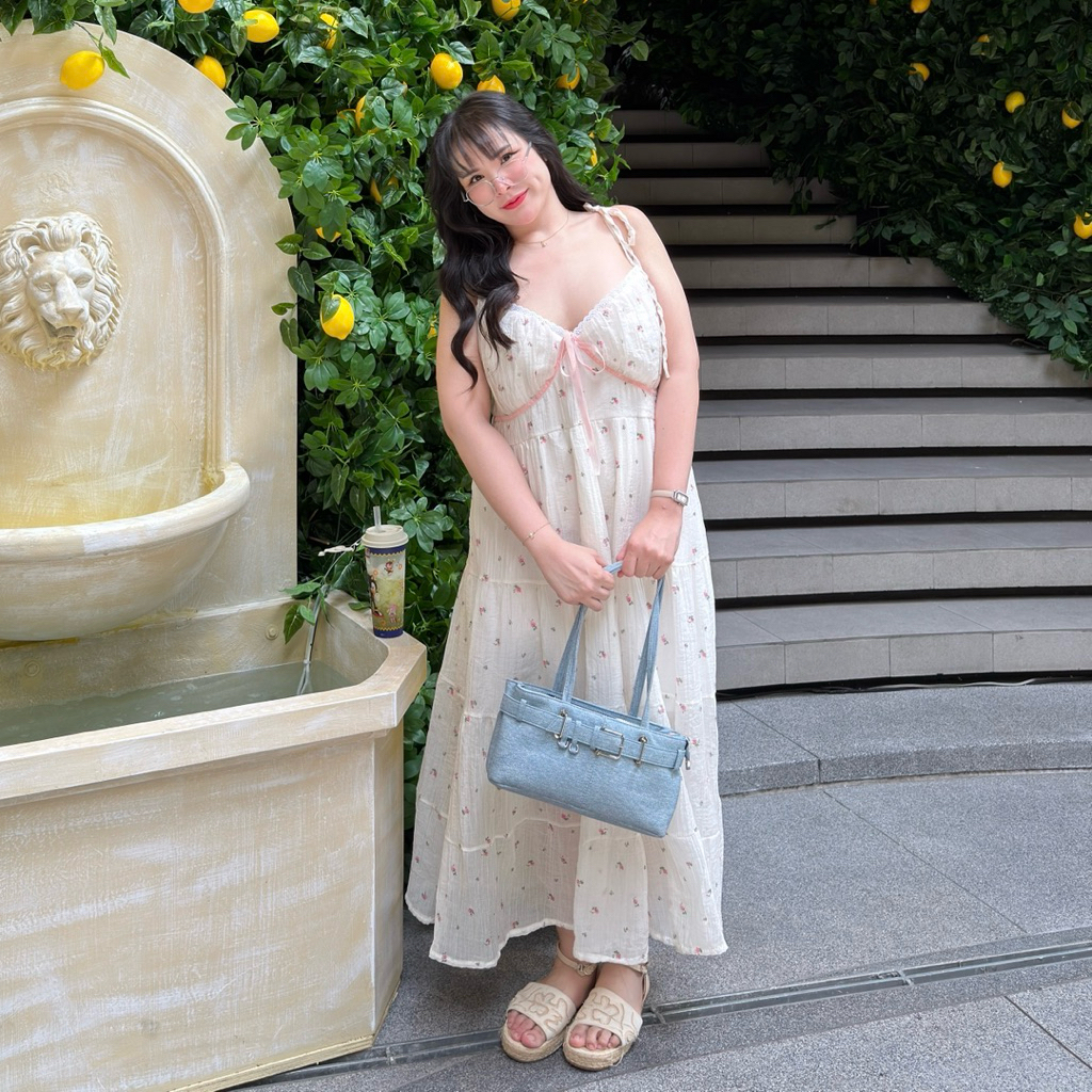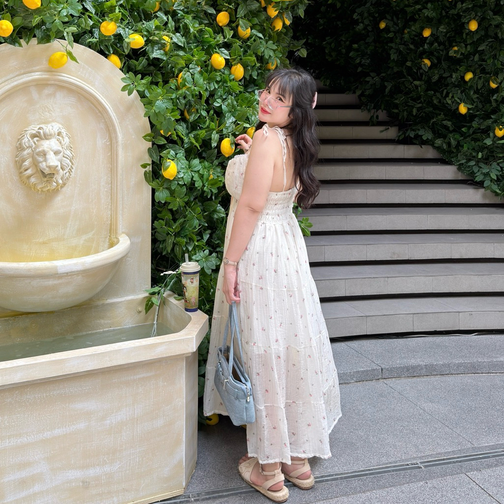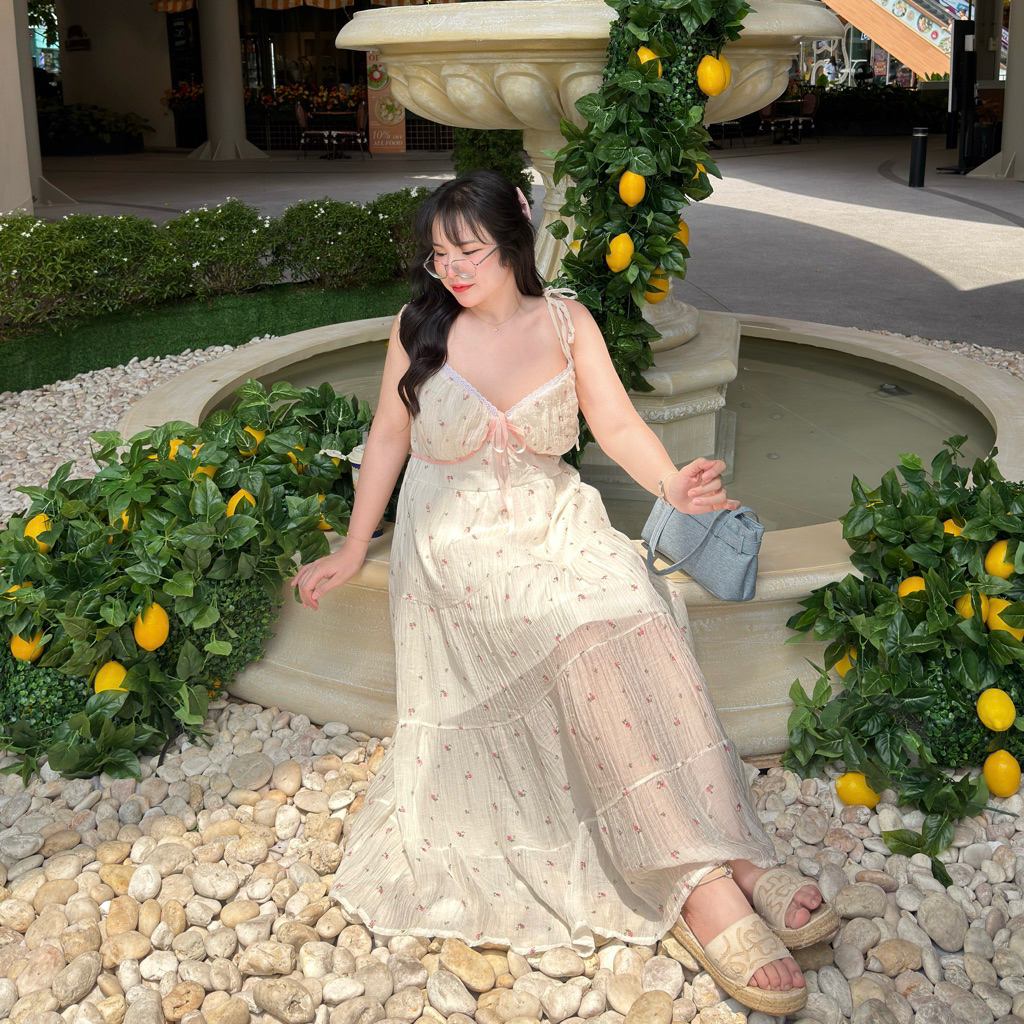 la pensée Dress เดรสสายเดี่ยวฟองเซ่ ลายดอกไม้ เดรสยาวสายผูก เดรสสาวอวบอ้วน💖🍰🌷 | Geebeety