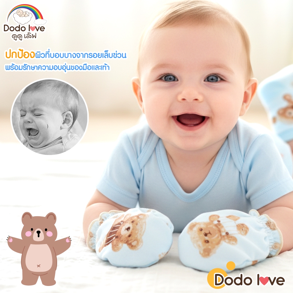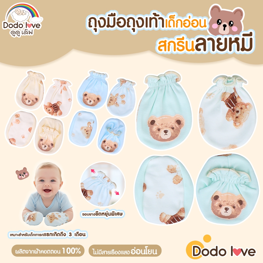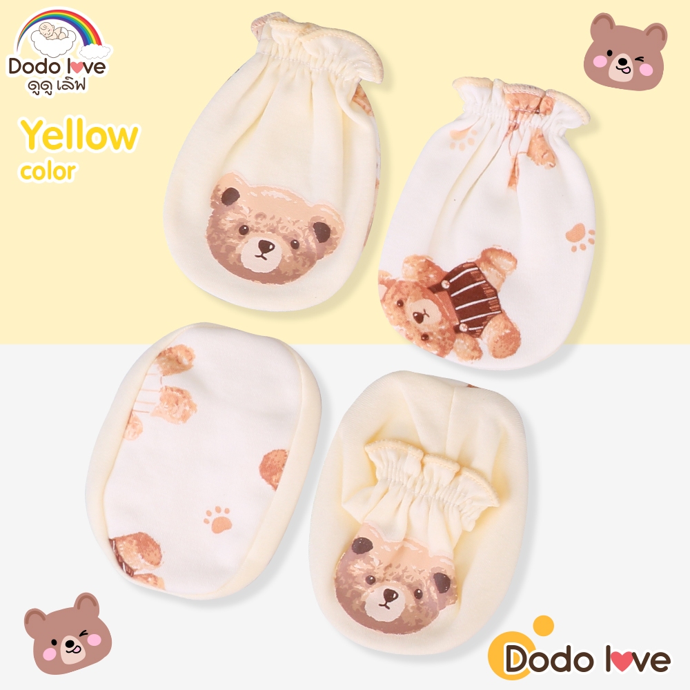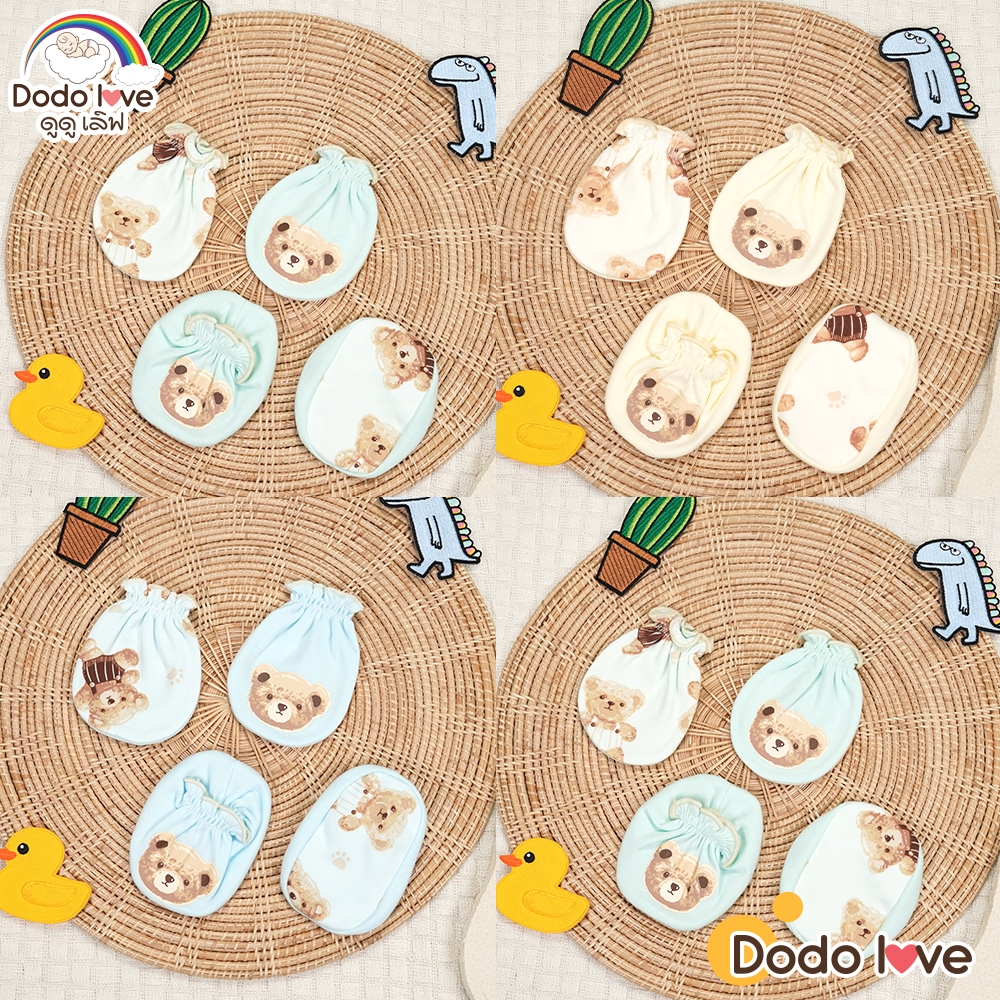 Dodolove ถุงมือ ถุงเท้า เด็กอ่อน สกรีนลายรูปหัวหมี ผ้าคอตตอน 100% สำหรับเด็กทารก เด็กแรกเกิด ถึง 3 เดือน