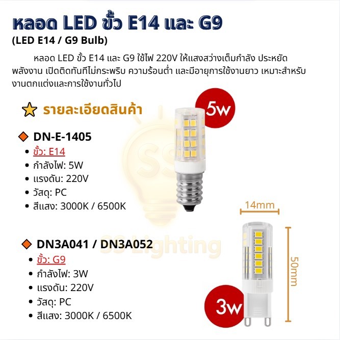 SS Lighting หลอดไฟ LED ขั้ว E14 และ G9 220V 3W 5W 9W ประหยัดพลังงาน ไฟประดับตกแต่ง