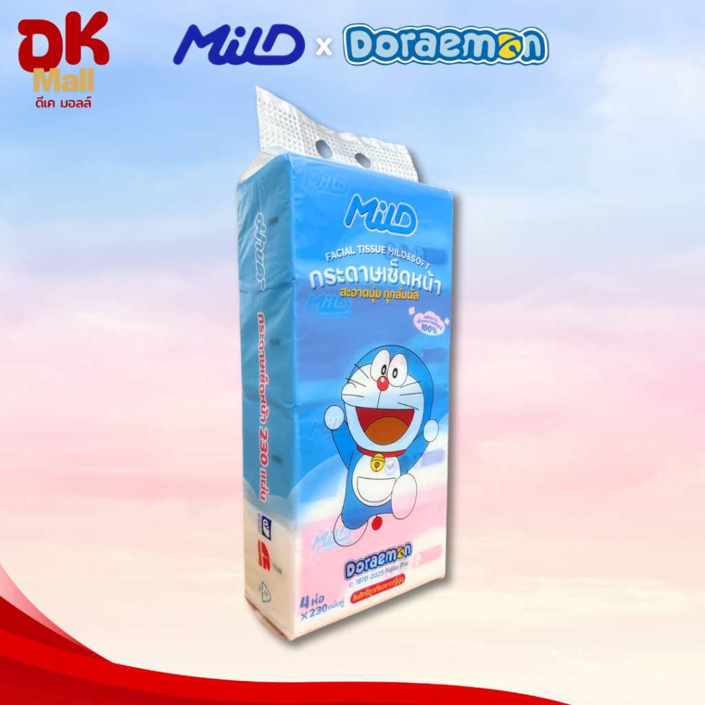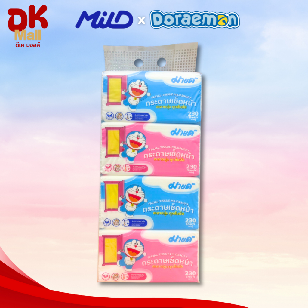 (live) MILD กระดาษทิชชู่เช็ดหน้ามายด์ โดเรมอน Doraemon ขนาด 230 แผ่นคู่ ลิขสิทธิ์แท้ 100% หนา 2 ชั้น (3 แพ็ค 12 ห่อ)