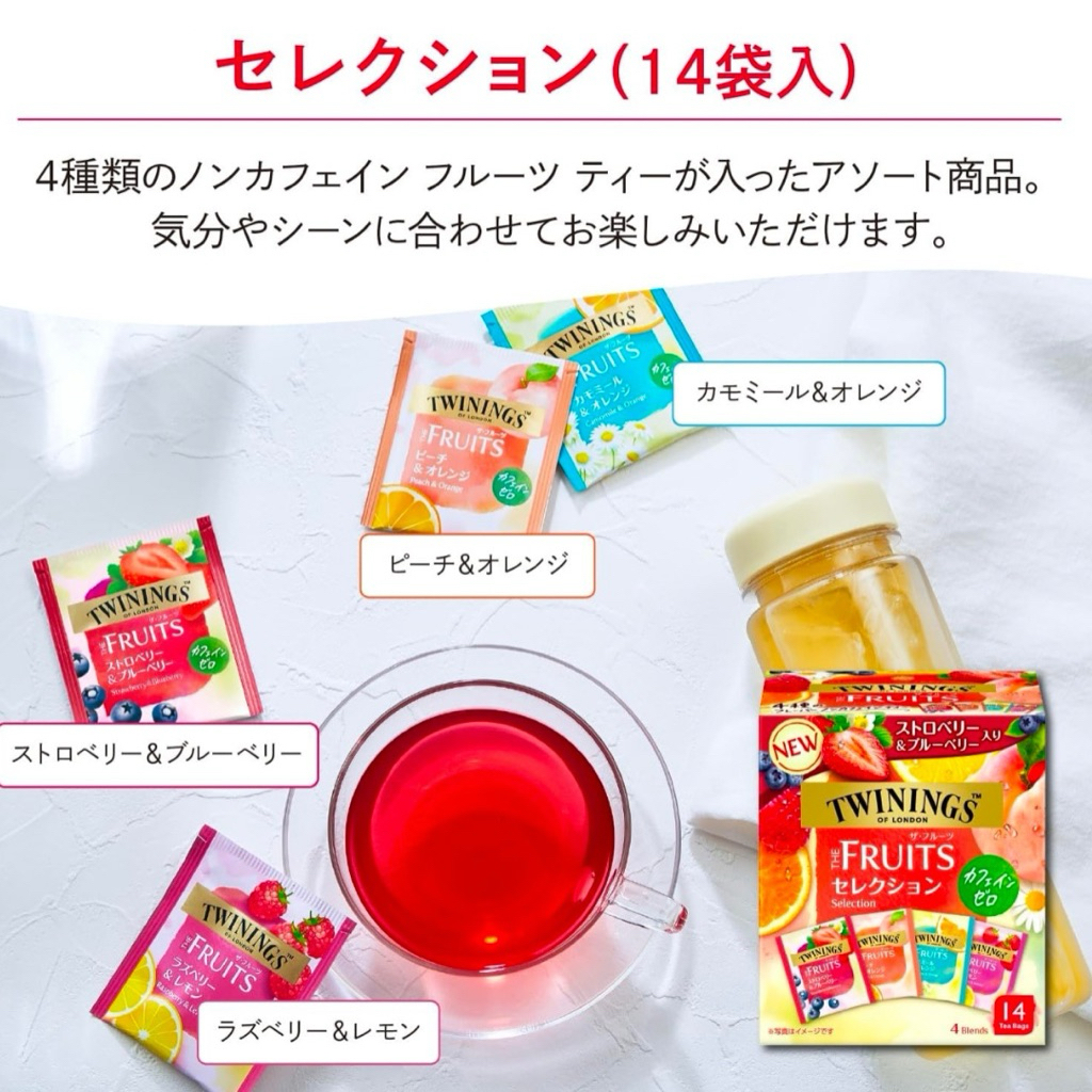 Twinings Fruit Selection ชาทไวนิงส์ ชาผลไม้ที่ได้รับความนิยม 4รสชาติ ไม่มีคาเฟอีน 1 กล่องบรรจุ 14 ซอง