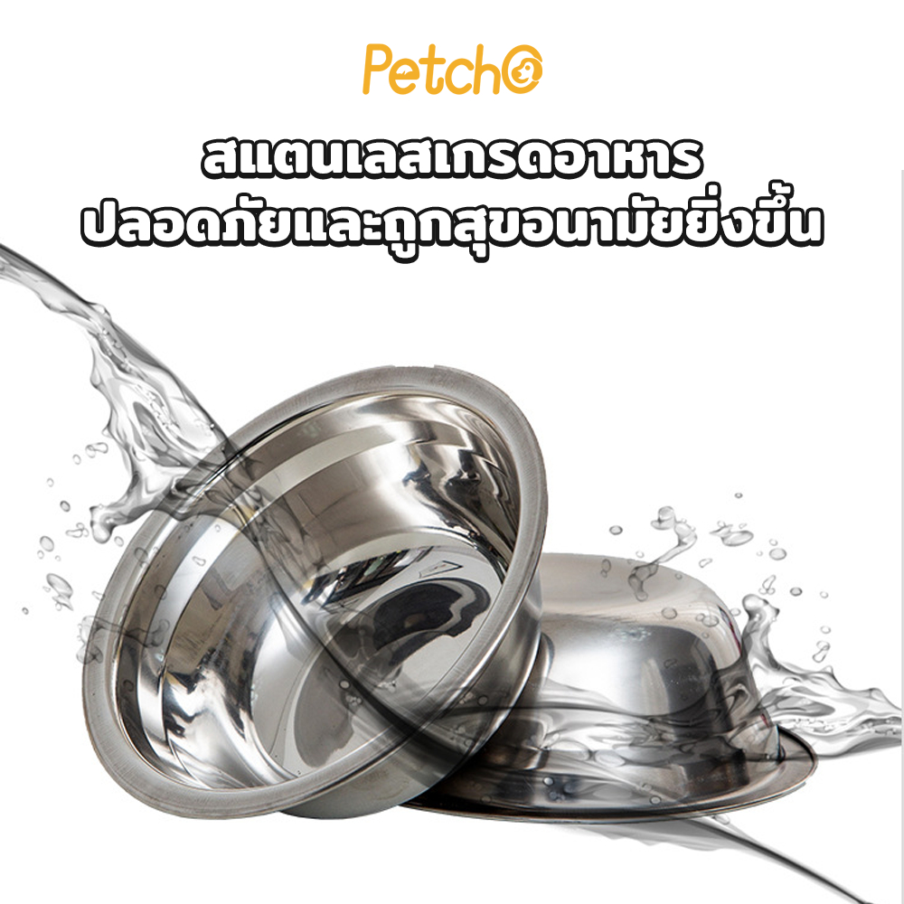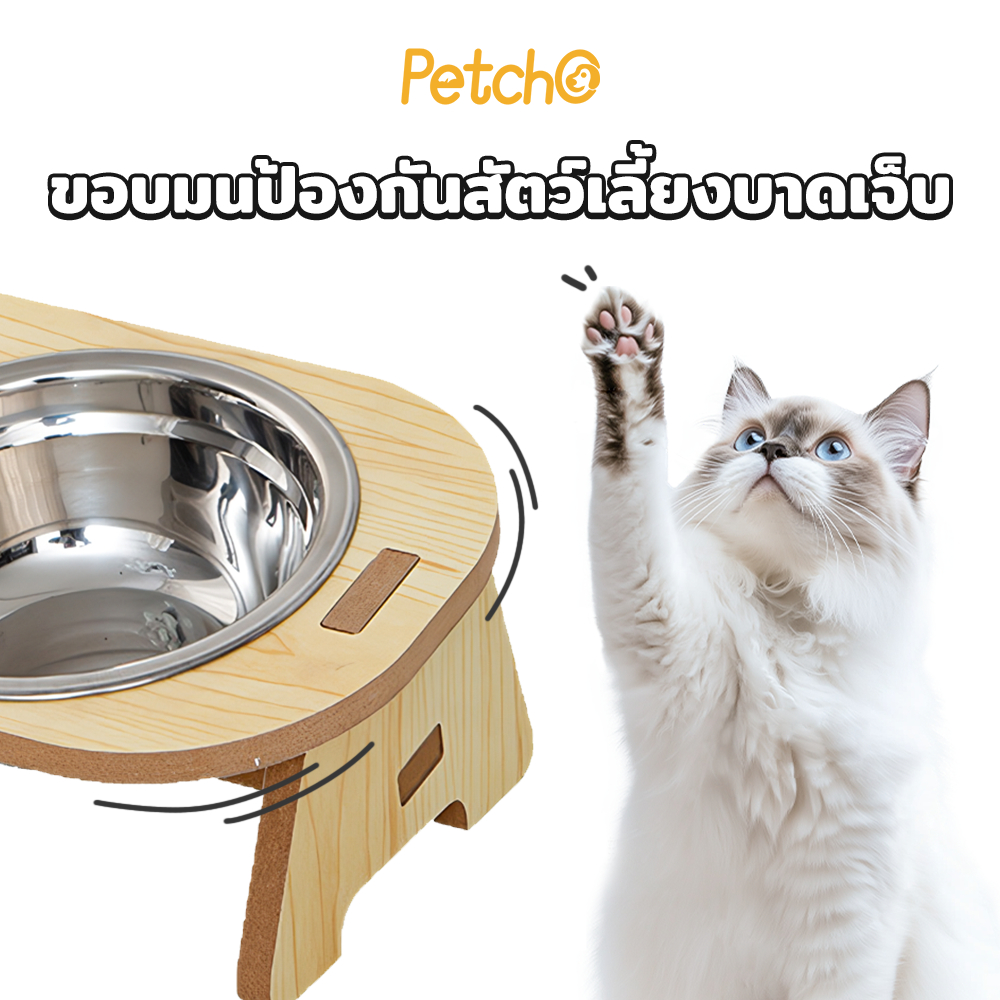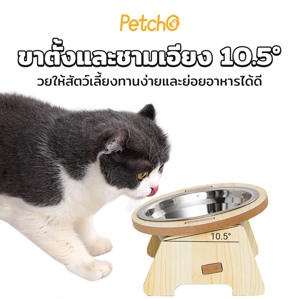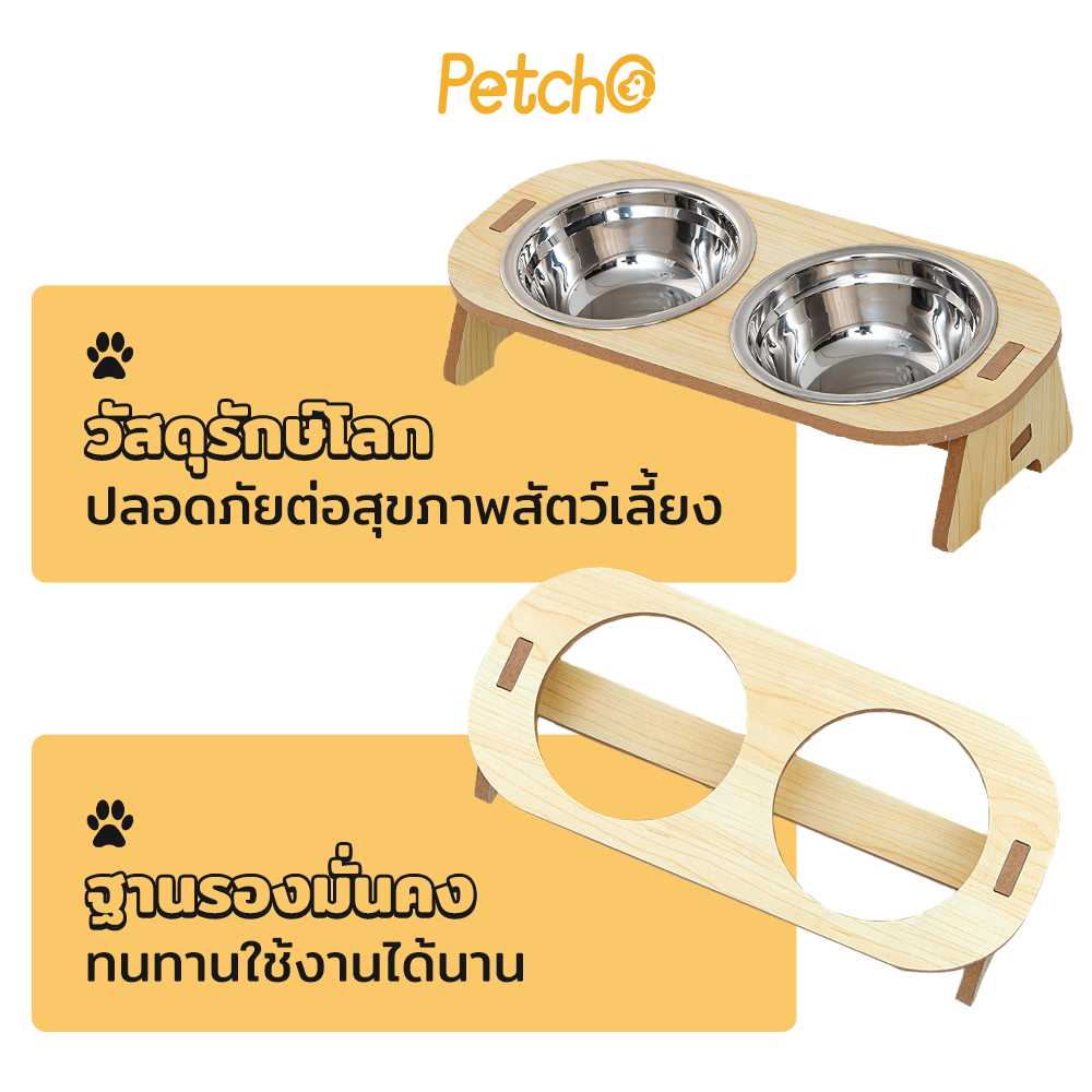 Petcho ชามอาหารสัตว์เลี้ยง ชามสแตนเลส ฐานไม้ ยกสูง สำหรับแมวและสุนัข ชามอาหารคู่ ปรับมุมเอียงได้ กันลื่น