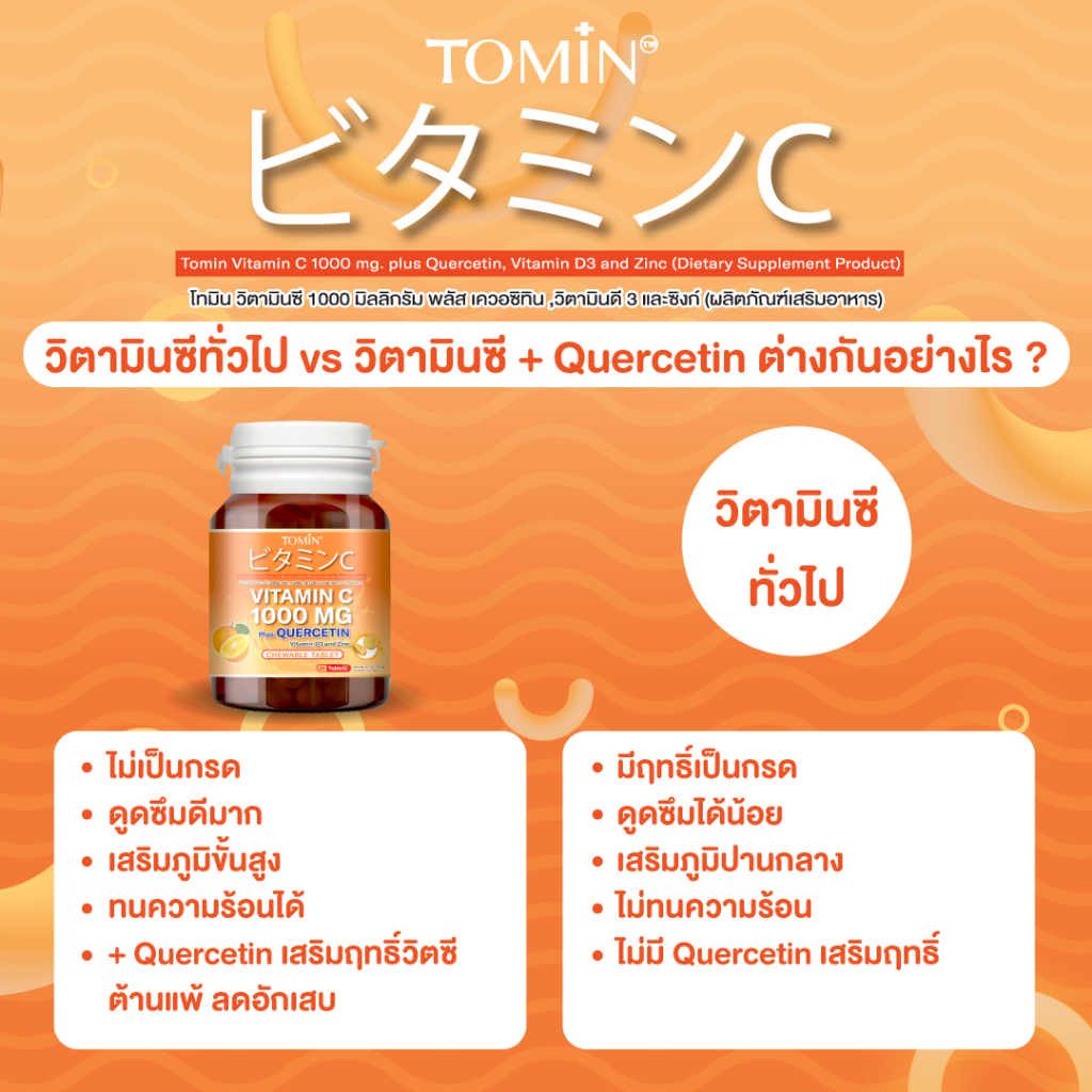 เม็ดอม Vitamin C 1,000 mg+Quercetin, Vitamin D3, Zinc TOMIN™️ วิตามินซี 1000 มก. อร่อย เสริมภูมิ