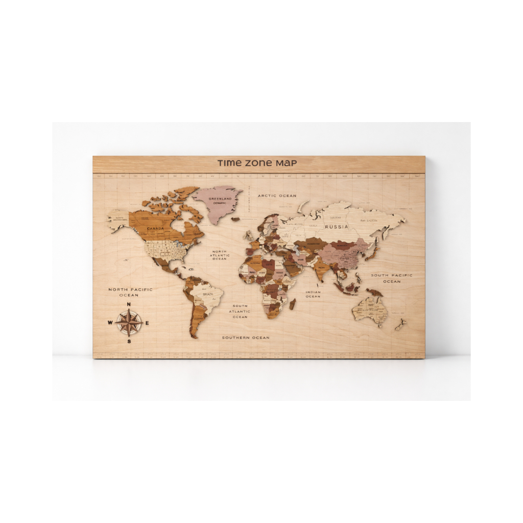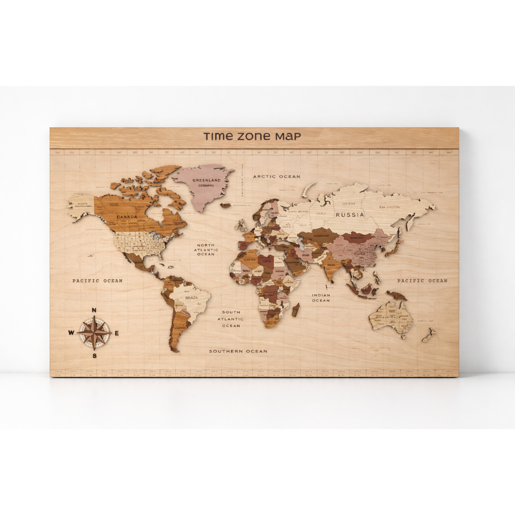 บอร์ดแผนที่โลกติดผนัง บอร์ดไม้ มี time zone ไซส์ M (ขนาด 156 x 100 x 2.5 ซม.)