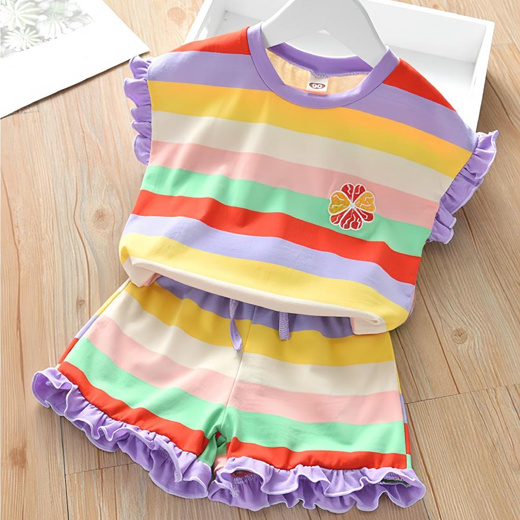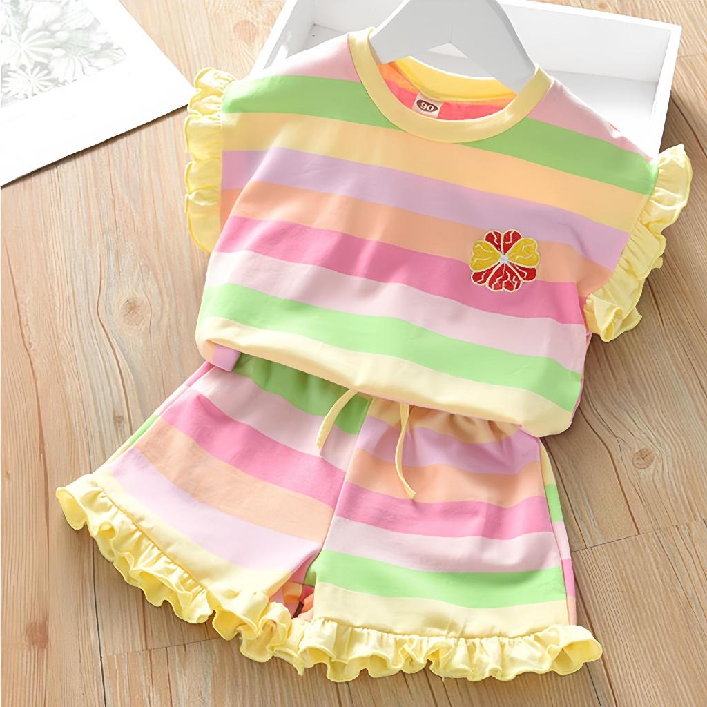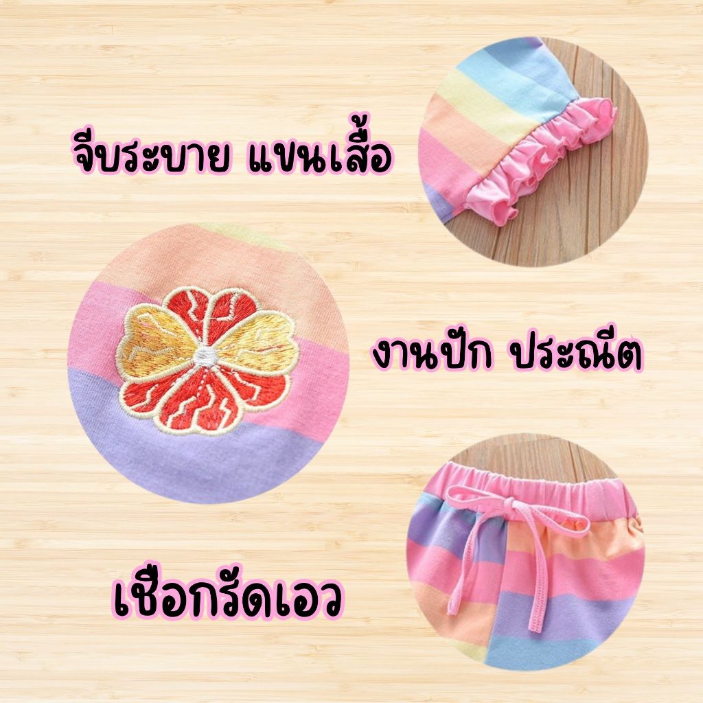 Moodeng Baby ชุด2ชิ้น เสื้อคอกลม แขนสั้น กางเกง สไตล์เกาหลี สําหรับเด็กผู้หญิง ลายปักดอกไม้สีชมพู สีรุ้งพร้อมส่งในประไทย