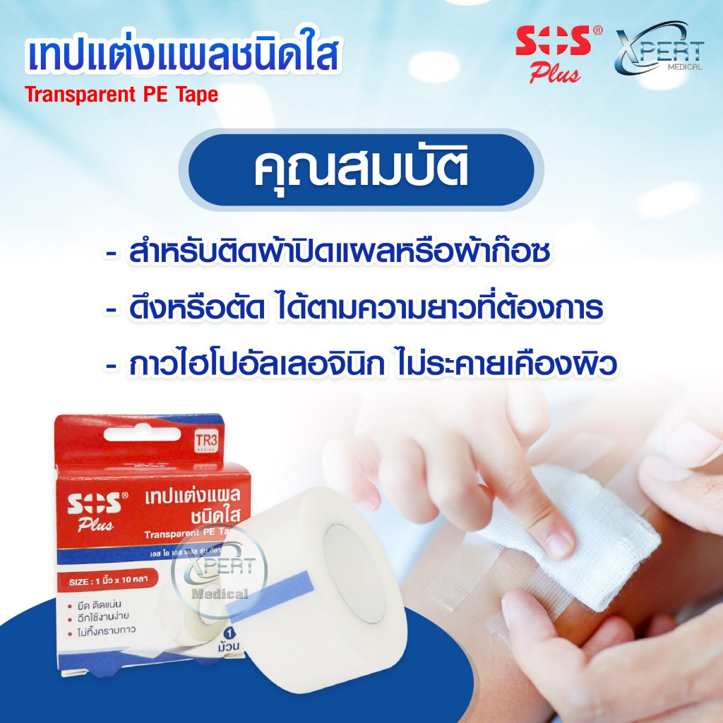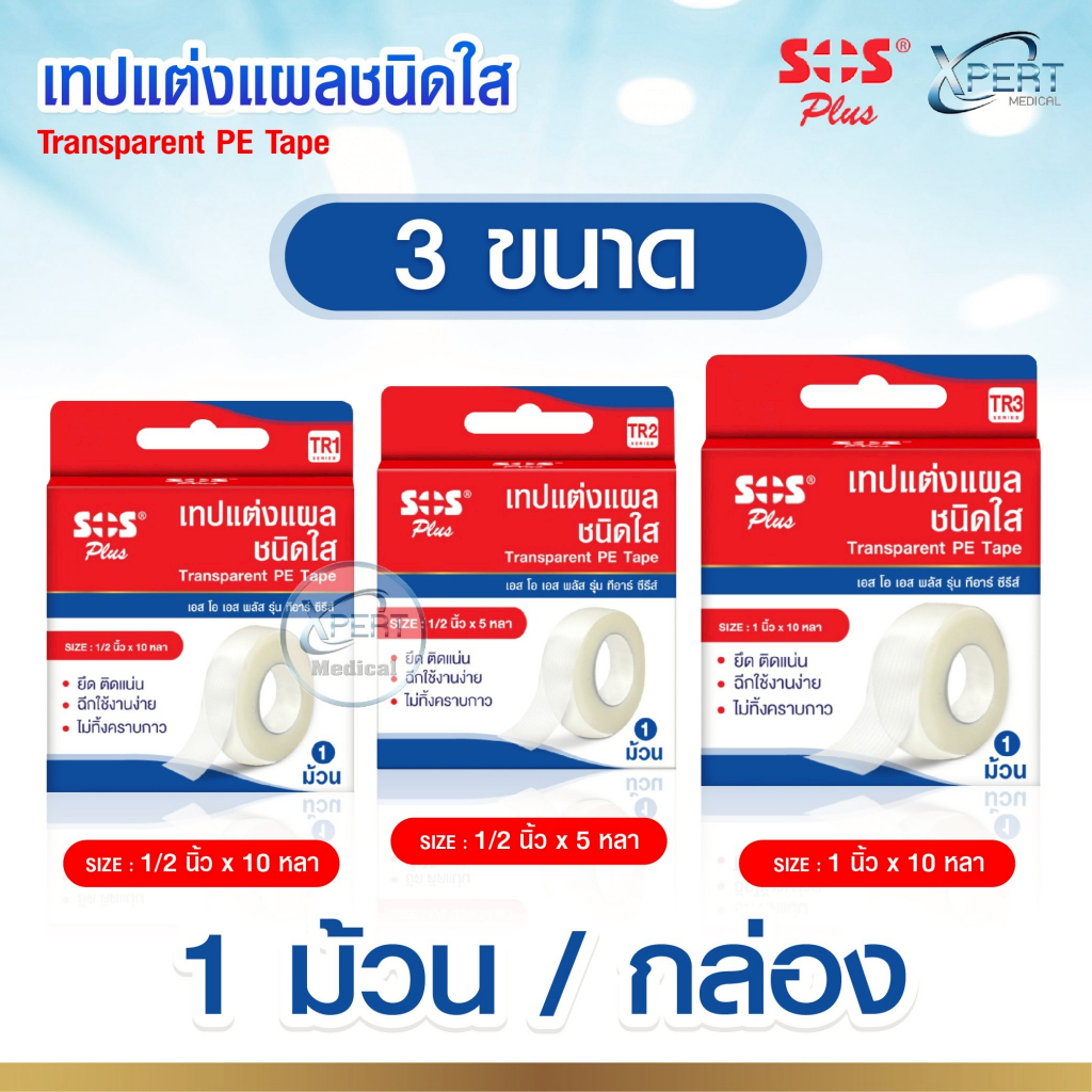 SOS Plus เทปใสสำหรับแต่งแผล เทปติดแผลทางการแพทย์ Transparent PE Tape รุ่น TR1 / TR2 / TR3 (บรรจุ 1 ม้วน/กล่อง)