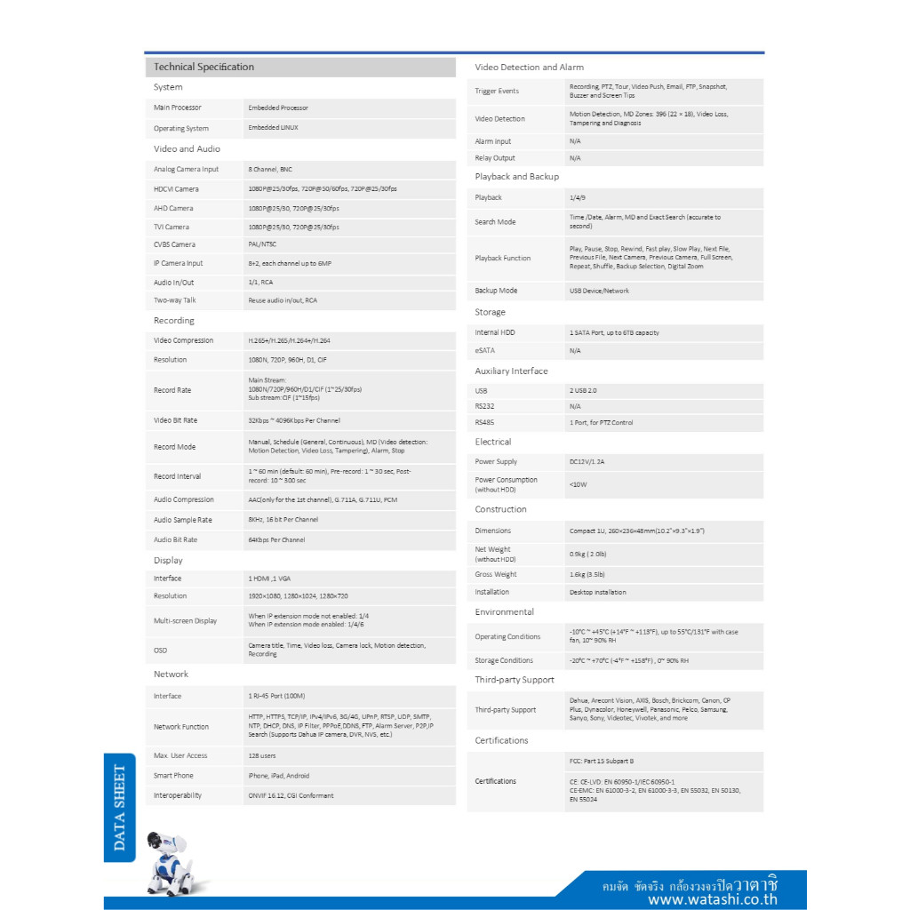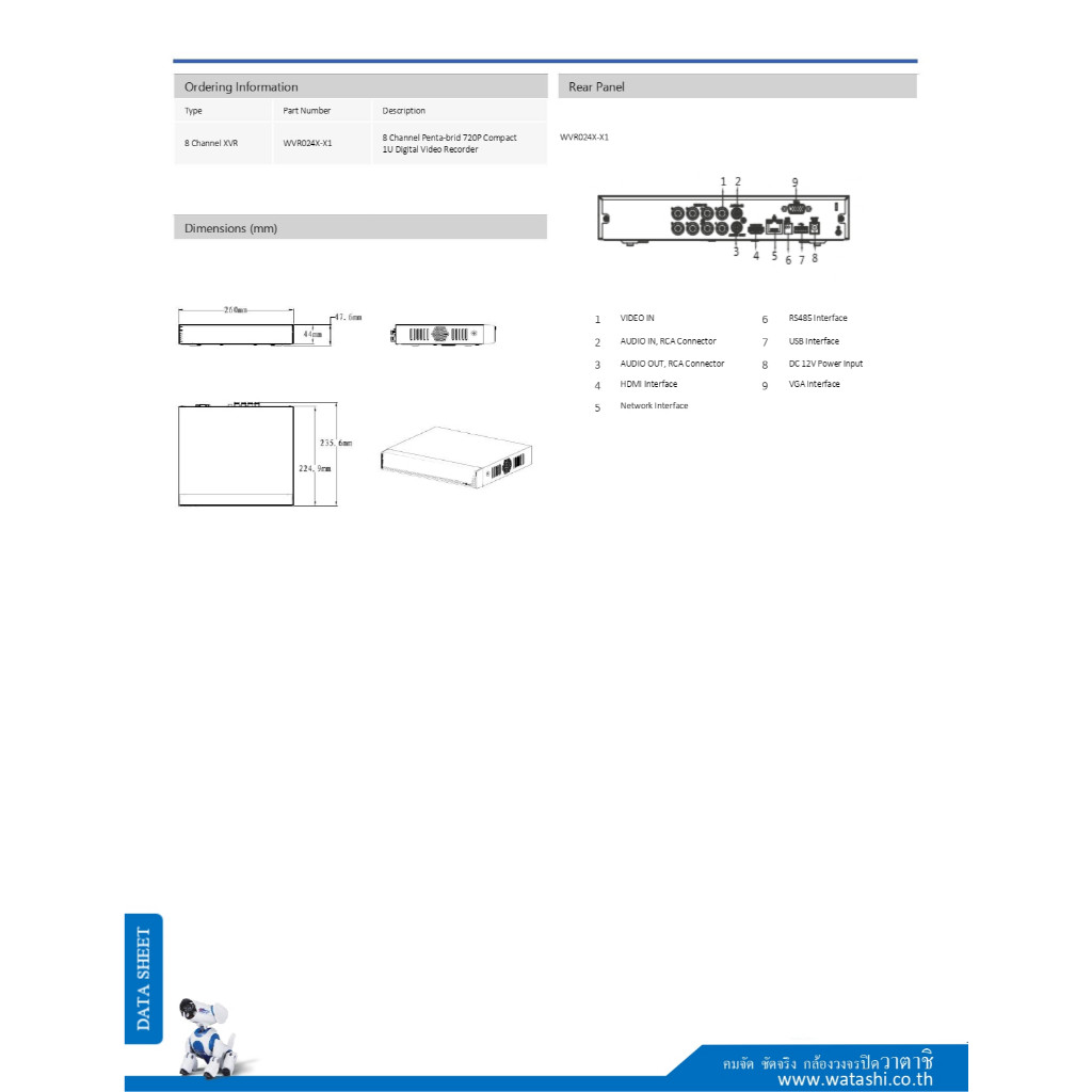 Watashi เครื่องบันทึกกล้องวงจรปิด HDCVI DVR 8CH รองรับ HDCVI/AHD/TVI/CVBS/IP รุ่น WVR024X-I