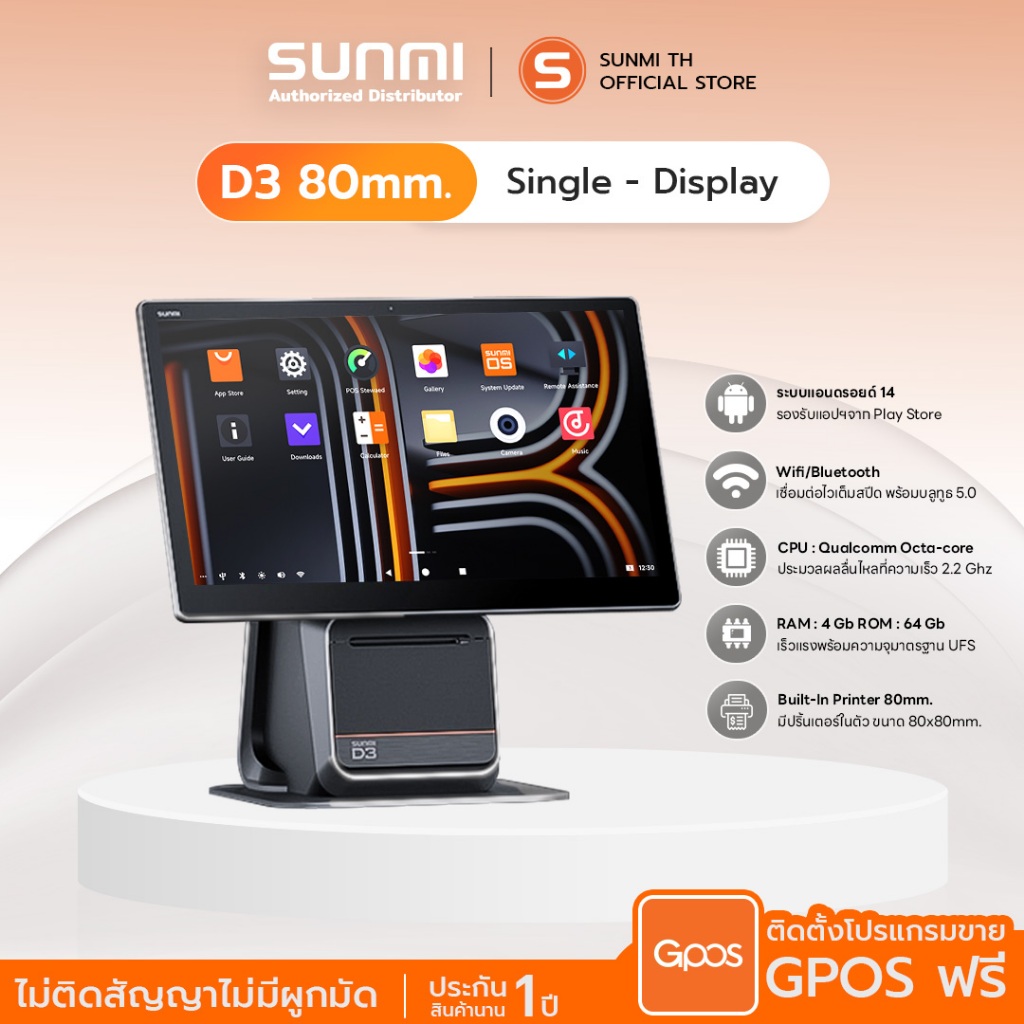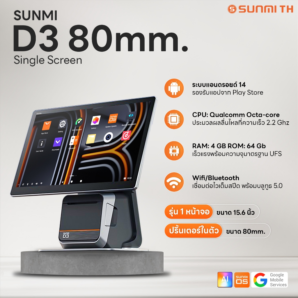 SUNMI D3 80MM Single Screen(1จอ) เร็วแรงกว่าด้วย RAM 4GB / ROM 64GB ปริ้นเตอร์ในตัว