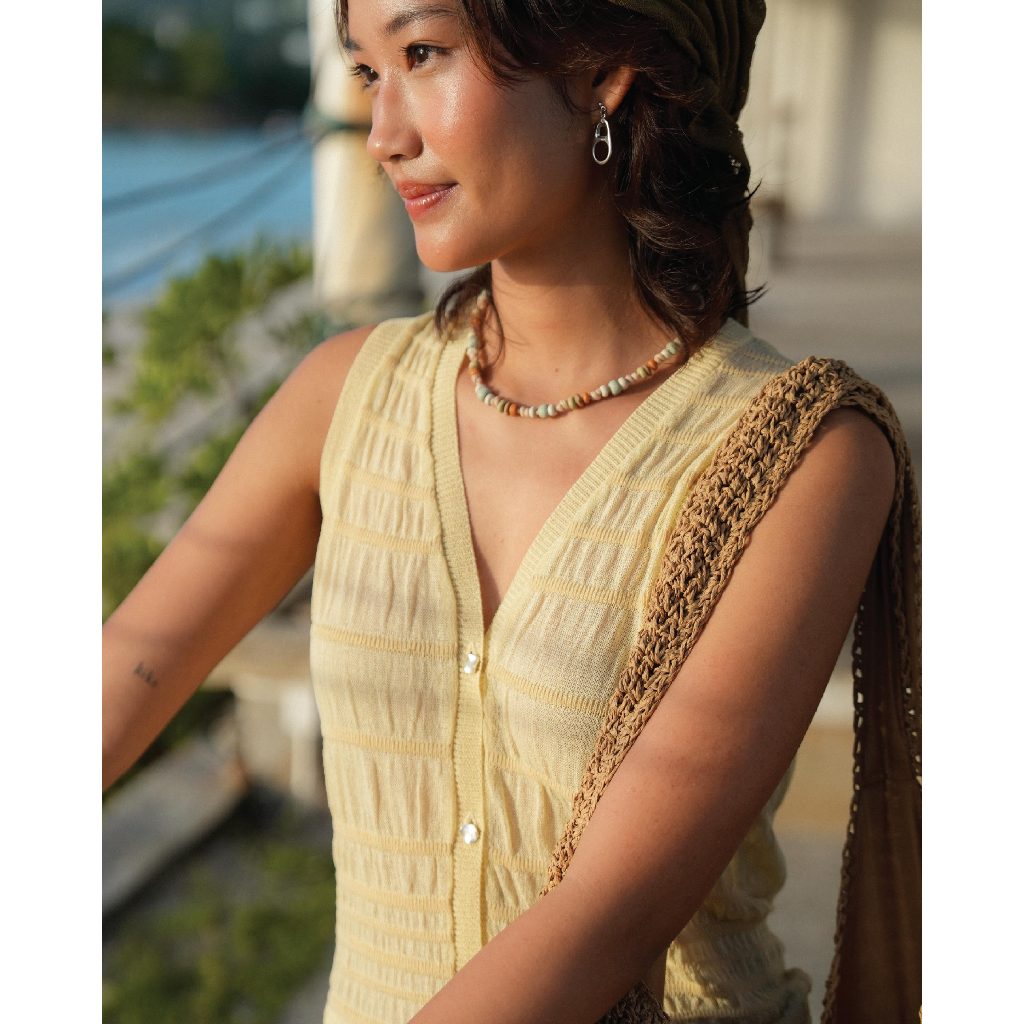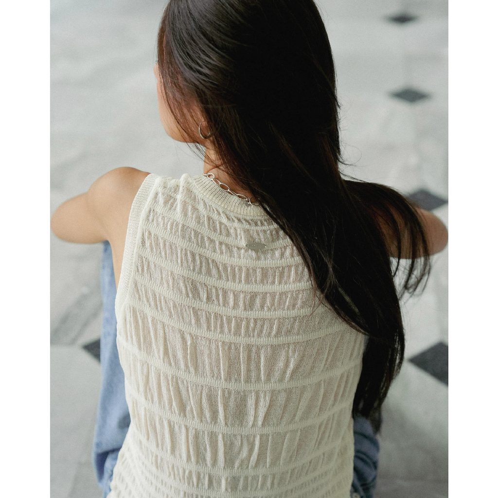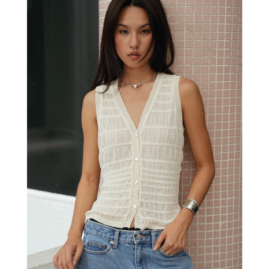 knitCircle - LAGOON Vest Top (3 สี) เสื้อvestไหมพรม คอวี ผ่าหน้า กระดุมสีเงิน ลายทอย่น โปร่งทั้งตัว เว้นช่วงกว้างสลับแคบ