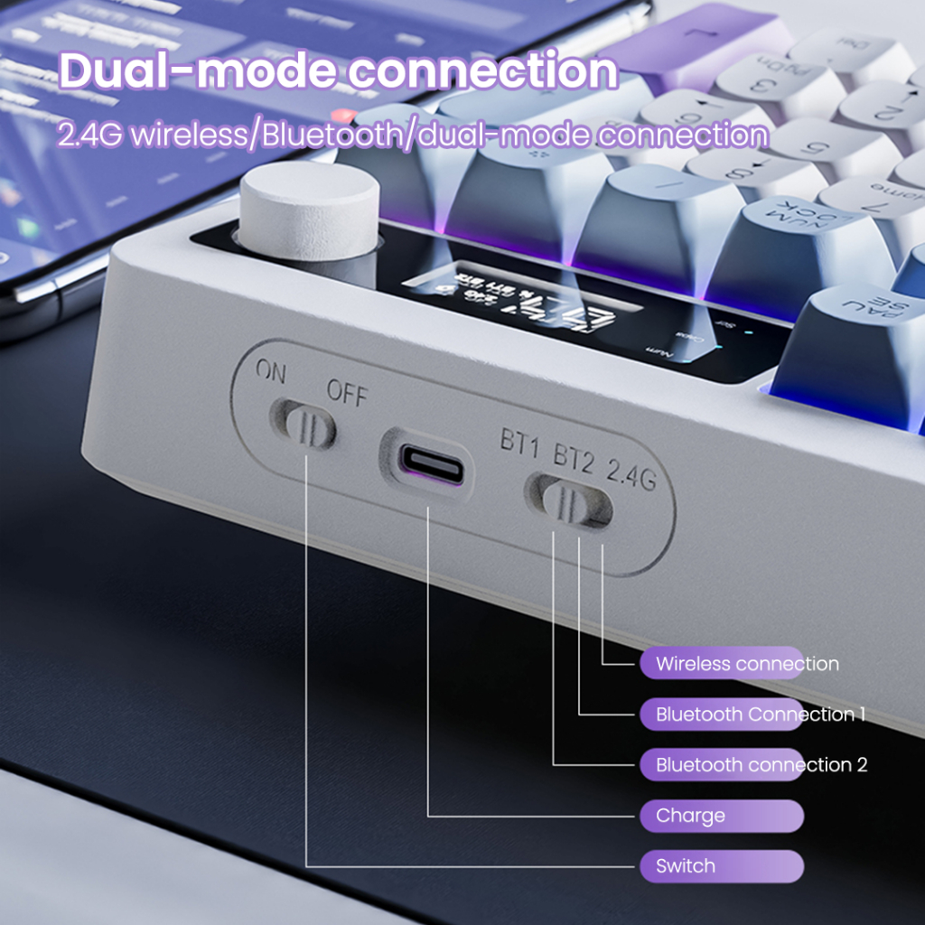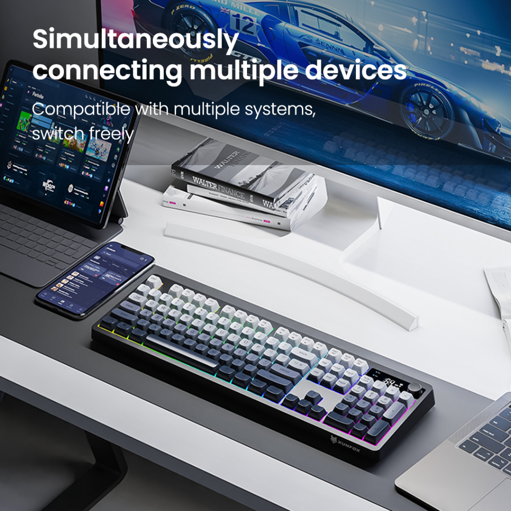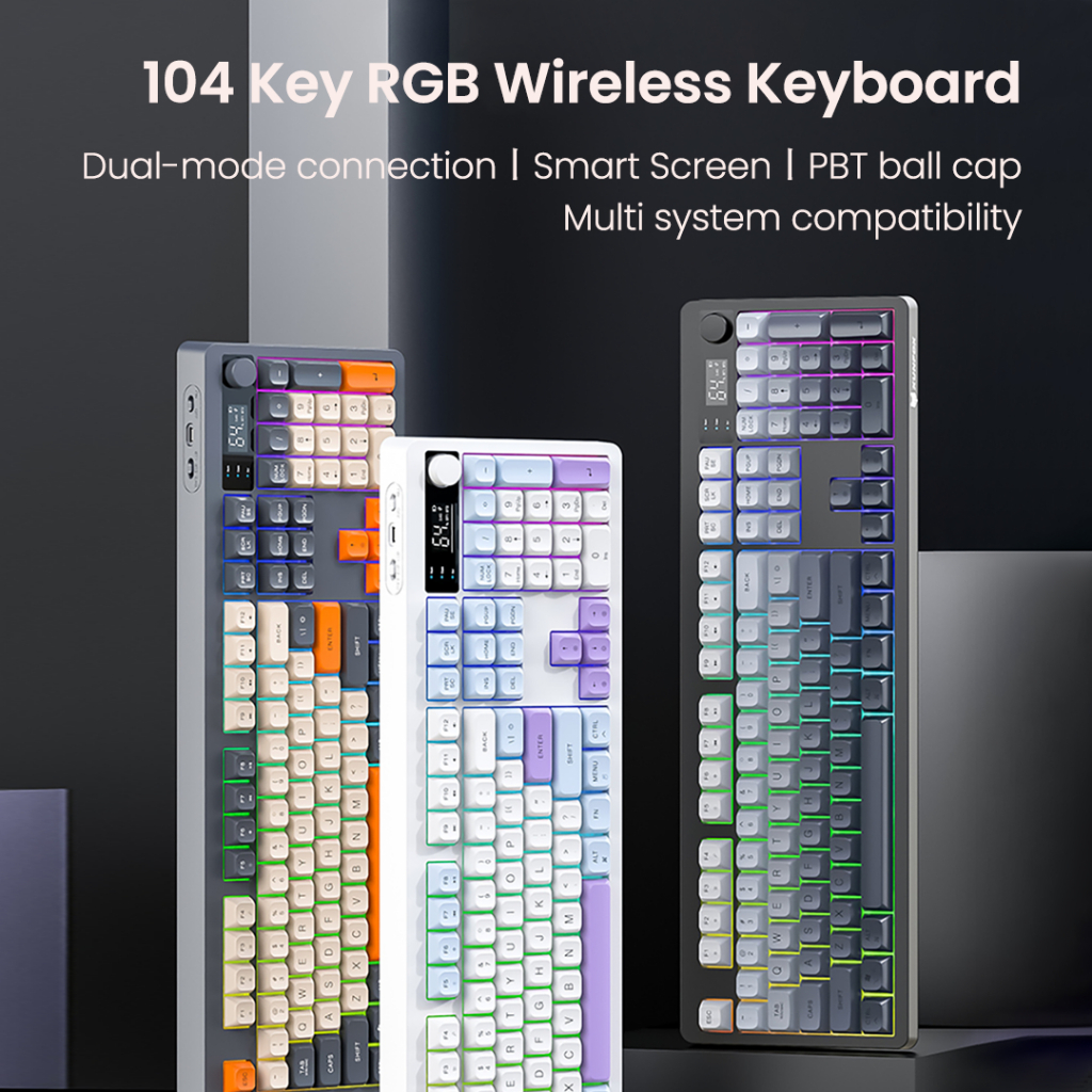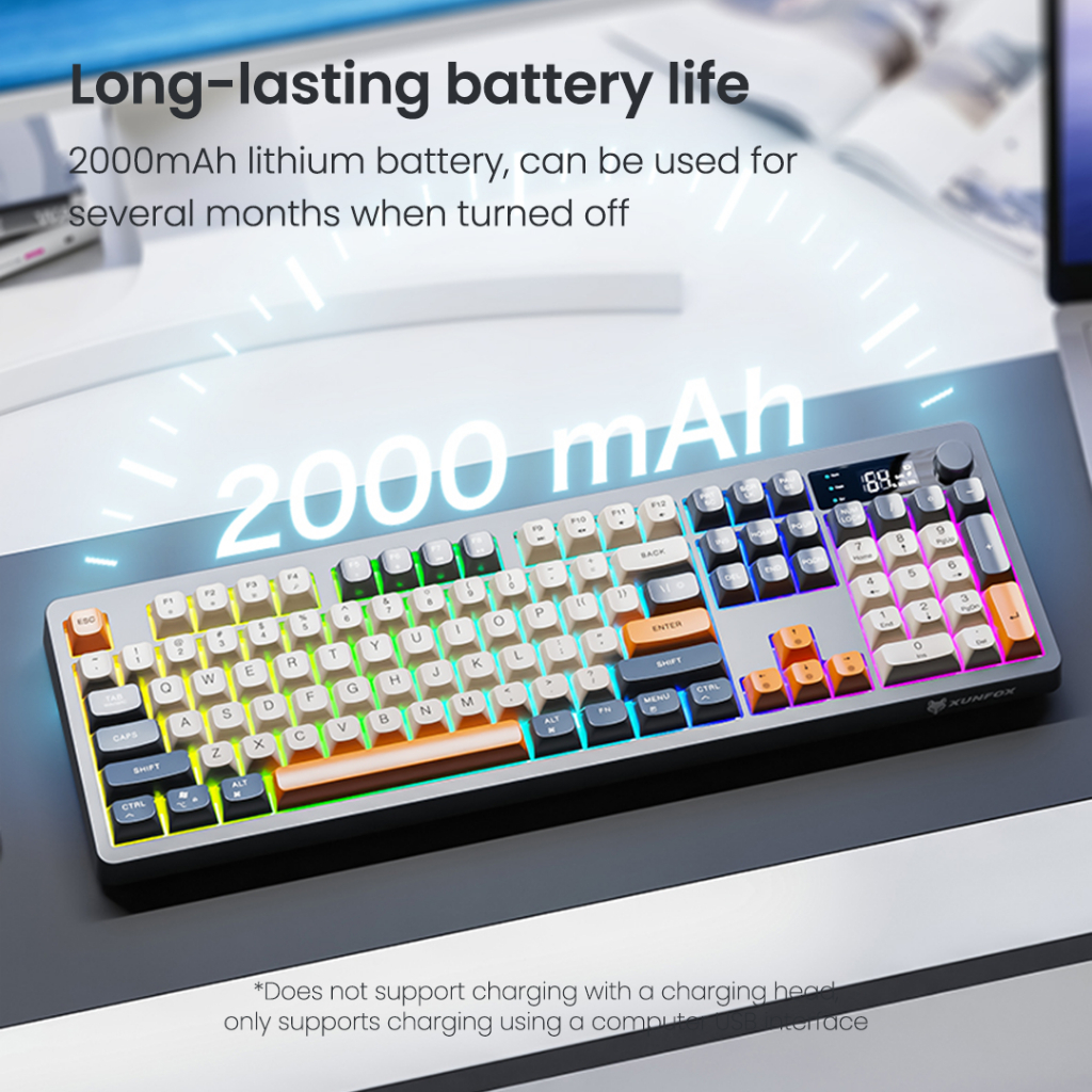 XUNFOX TK100 RGB คีย์บอร์ดไร้สายการเชื่อมต่อสองโหมดพร้อมจอแสดงผลดิจิตอลอัจฉริยะการออกแบบตามหลักสรีรศาสตร์