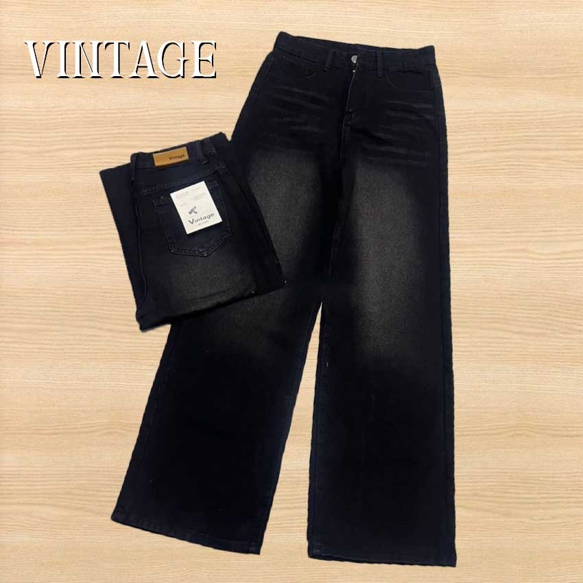 Vintage รุ่น 8801 กางเกงยีนส์ ขายาว ทรงกระบอก เอวสูง ทรงกระบอก สีดำฟอก แต่งเฟดขา กางเกงยีนส์ขากระบอก