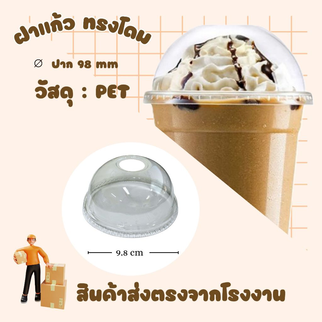 ฝาแก้วพลาสติก ฝาปิดแก้ว PET ใส ทรงโดม ขนาดปาก 98 mm(แพ็ค 50 ชิ้น)