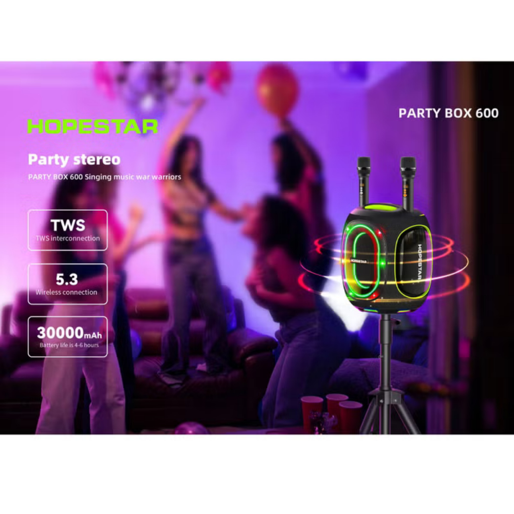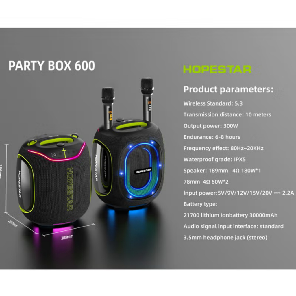 HOPESTAR PARTY BOX 600 ลำโพงบลูทูธ ปาร์ตี้ 300W พร้อม ไมค์ลอย 2 อัน ปรับเสียงไมค์ได้ มีไฟ RGB ปรับเบส 3 โหมด IPX5