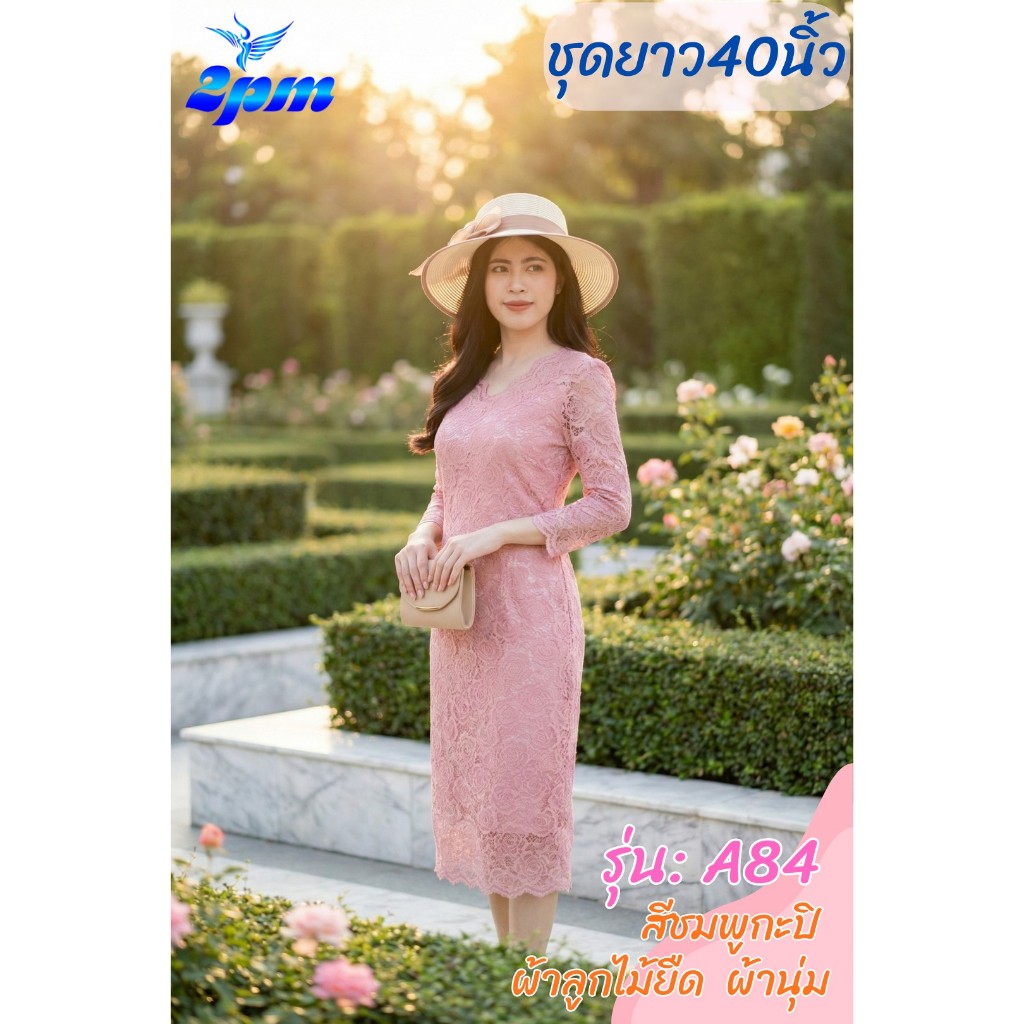 2PM (A84) เดรสลูกไม้ สาวอวบ คอวี เดรสยาว40นิ้ว ลูกไม้ยืด