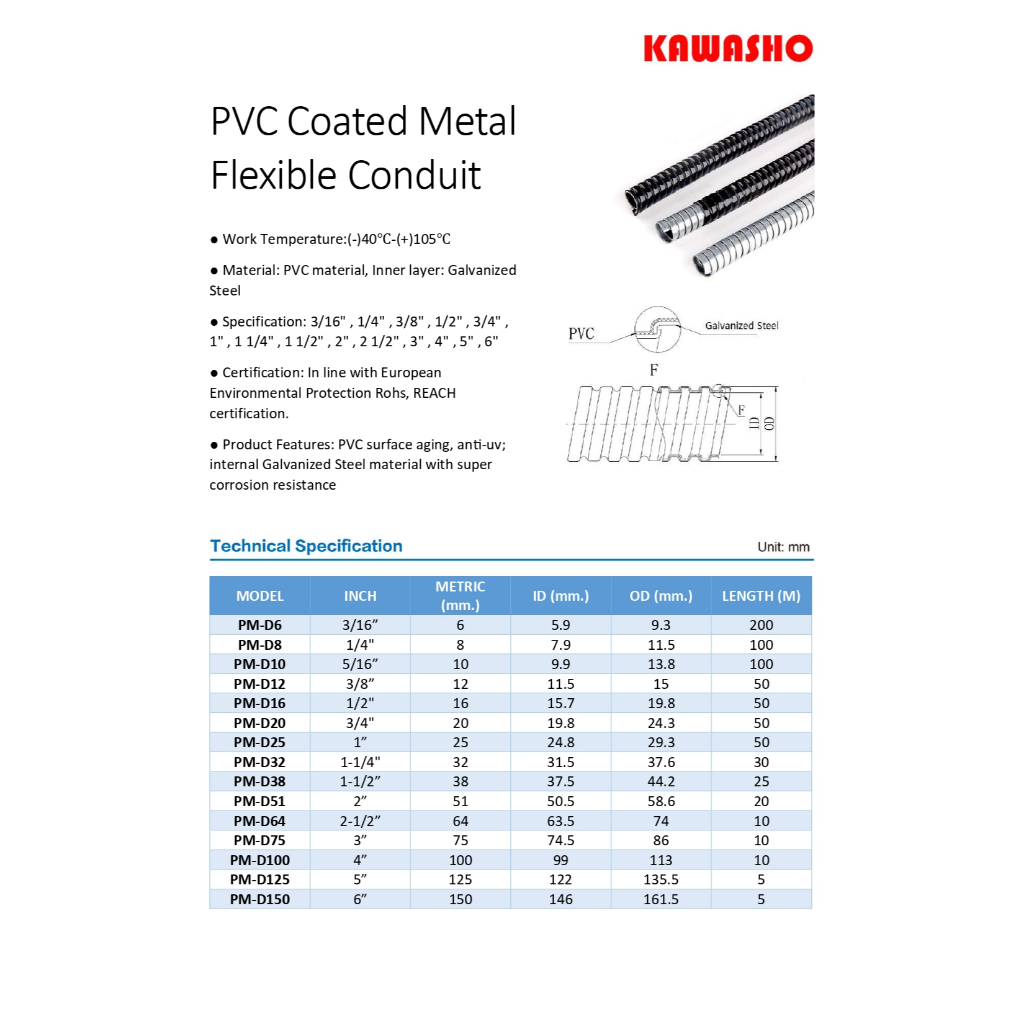 ท่อเฟล็กซ์ ท่ออ่อนกันน้ำร้อยสายไฟสีเทา ขนาด 3/8" 3หุน (Flexible Conduit) ยี่ห้อ KAWASHO (ยาว 50M./ROLL)
