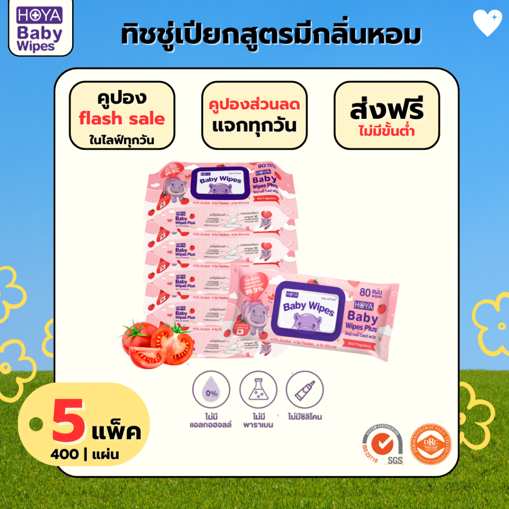 (แพ็ค5ห่อ มีน้ำหอม)HOYA ทิชชู่เปียก baby Wipes Plus 80แผ่น/ห่อ สูตรมีกลิ่นหอม อ่อนโยนสำหรับผิวบอบบาง