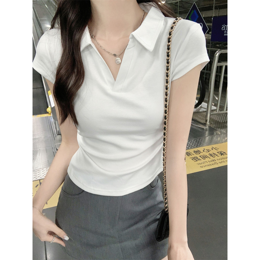 Bella Shop เสื้อยืดคอโปโลแขนสั้นสีพื้นสำหรับผู้หญิง ทรงเข้ารูปและคอตั้งสุดเก๋