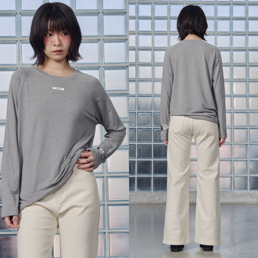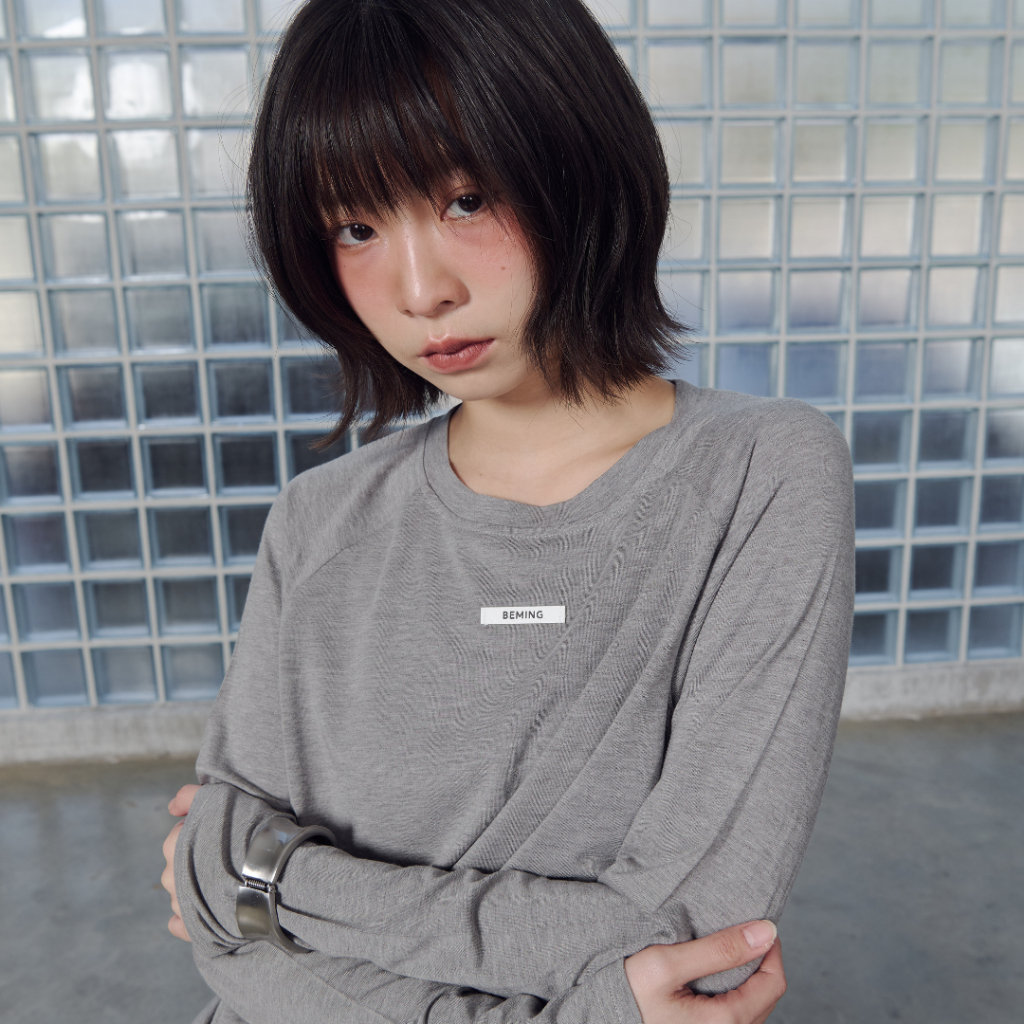 Bemingtop1078(S-2XL)-BMG Crew Neck Tee - เสื้อแขนยาวคอกลมสไตล์มินิมอล โทนเรียบ ปักป้ายโลโก้ BEMING