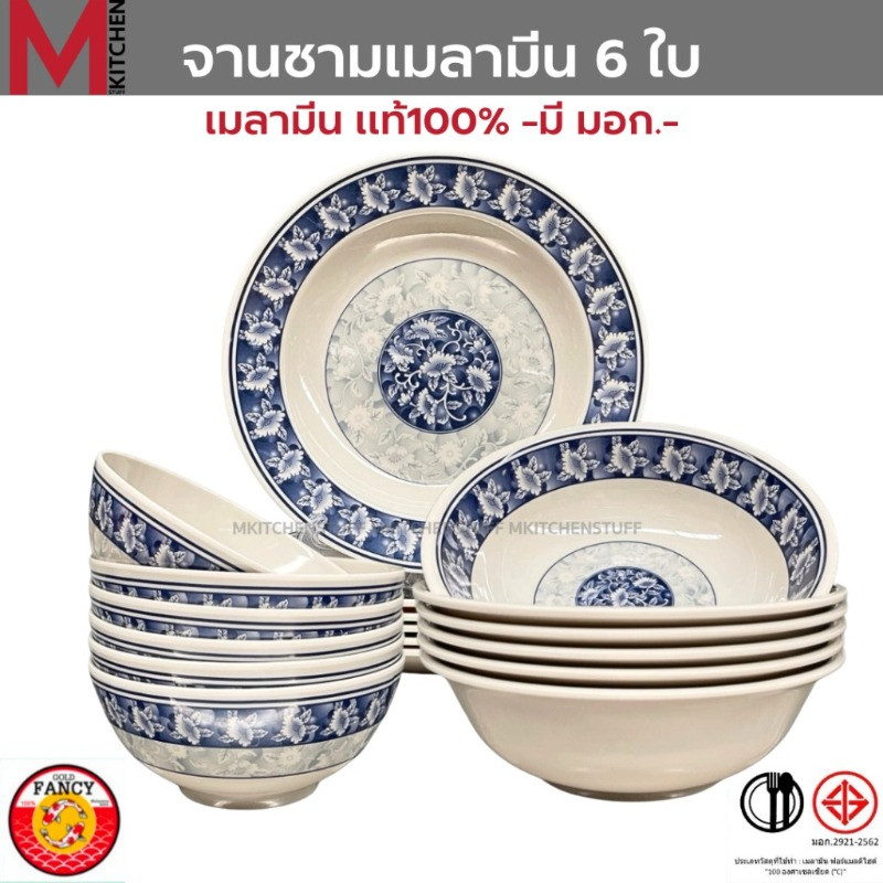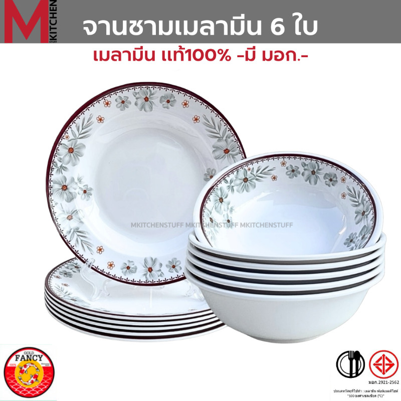 M KITCHEN ชุดจานชาม เมลามีนแท้ 100% 6ใบ จาน ชาม ถ้วย มอก ถูกต้อง (A3)