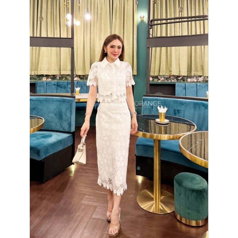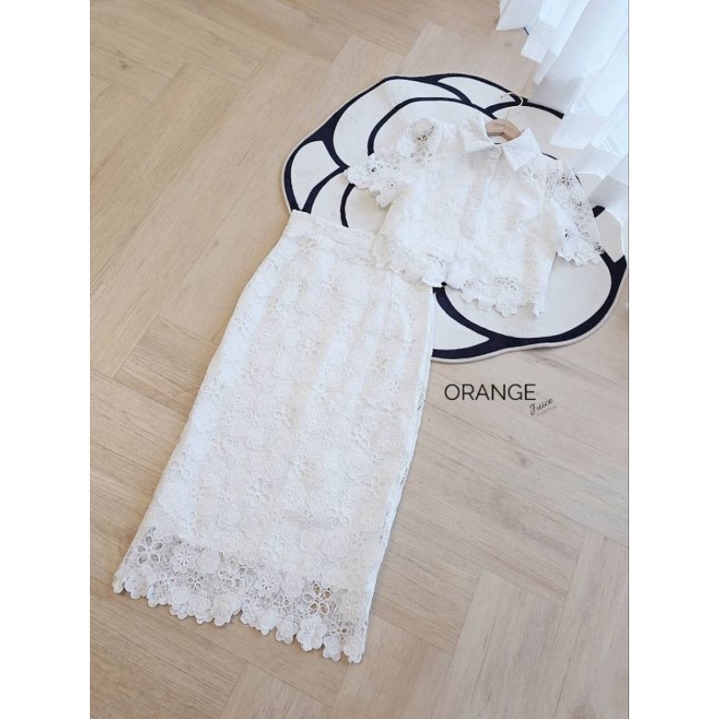 ชุดเซ็ตลูกไม้ขาว ชุดเซ็ตลูกไม้ดำ S-5XL Set2ชิ้น ชุดสาวอวบ เสื้อแขนสั้นกระดุมหน้า+กระโปรงลูกไม้ทรงสอบ งานป้าย OrangeJuice