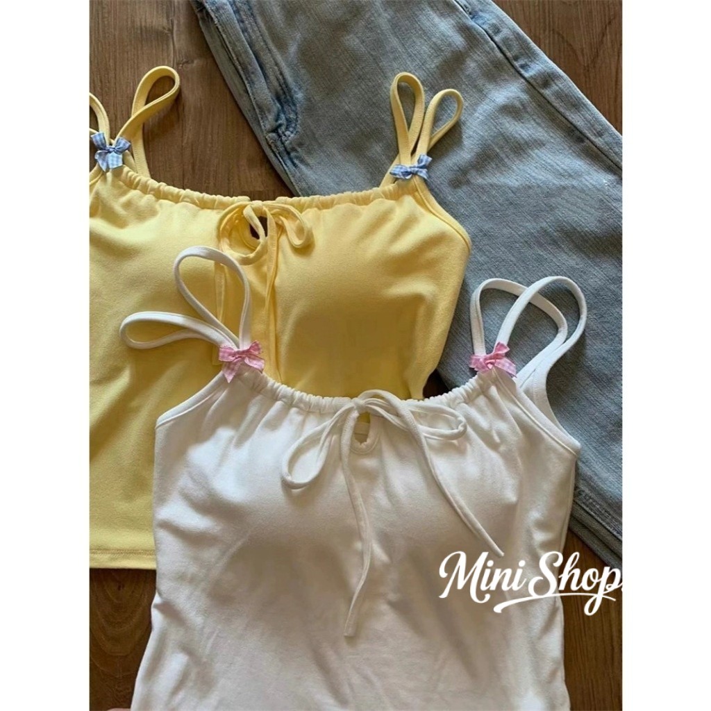 Mini shop🌸พร้อมส่ง🌸สายเดี่ยว เส้นคู่โบว์สองข้าง น่ารัก ลายเรียบ เชือกด้านหน้า อก32-38 มีฟองน้ำ เสื้อกล้าม(FY6809-J)
