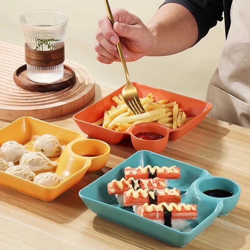 COZII จานพร้อมช่องใส่น้ำจิ้ม หลากสี ถาดใส่อาหาร แบบพลาสติก มีช่องใส่น้ำจิ้ม เอนกประสงค์