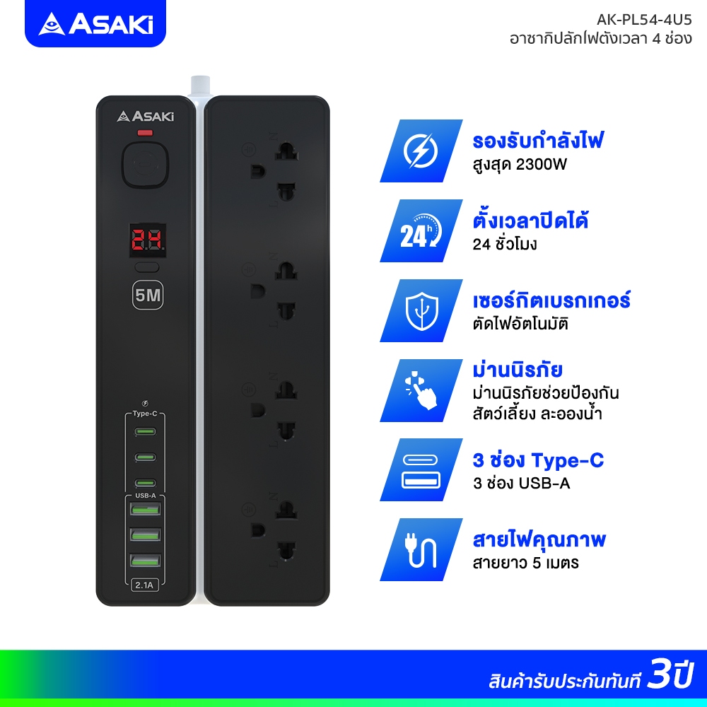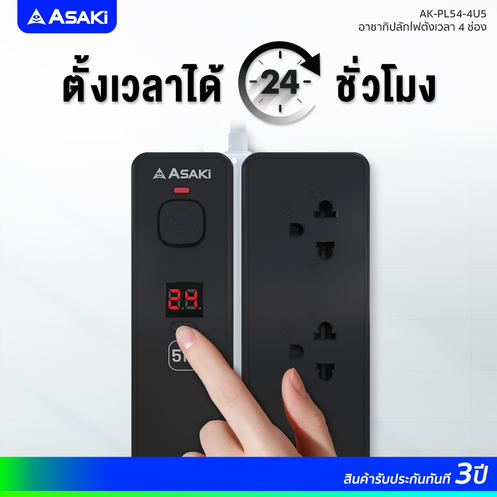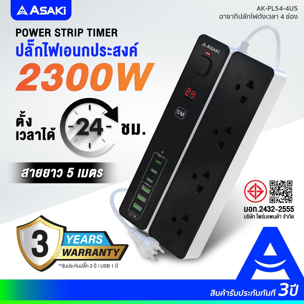 Asaki Power Strip Timer ปลั๊กไฟ มอก. ตั้งเวลาตัดไฟ กำลังไฟ 2300W ยาว 5m รุ่น AK-PL54 4U5 ประกัน 3 ปี