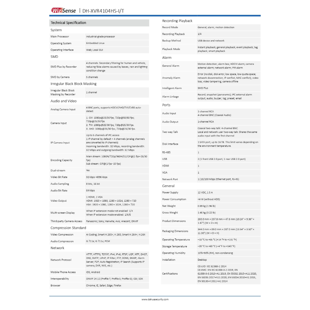 Dahua เครื่องบันทึกกล้องวงจรปิด รุ่น XVR4104HS-i/T / XVR4108HS-i/T / XVR4116HS-i/T - แบบเลือกซื้อ