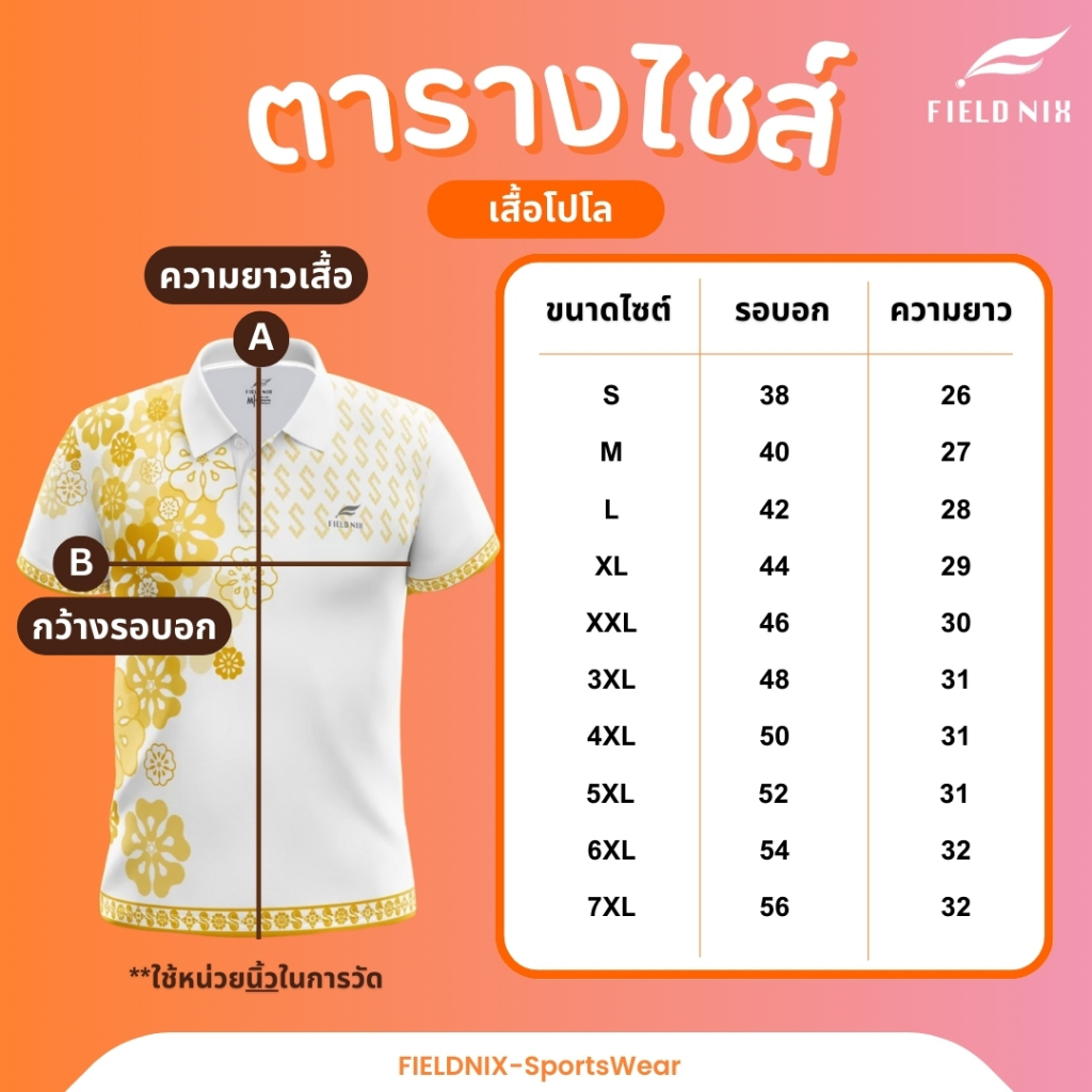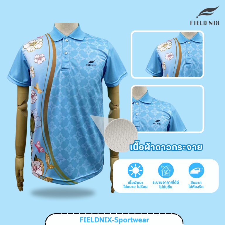 FIELDNIX เสื้อโปโลพิมพ์ลาย ไทยดอกมะลิ สีฟ้า ผ้านุ่ม ใส่สบาย ไม่ต้องรีด