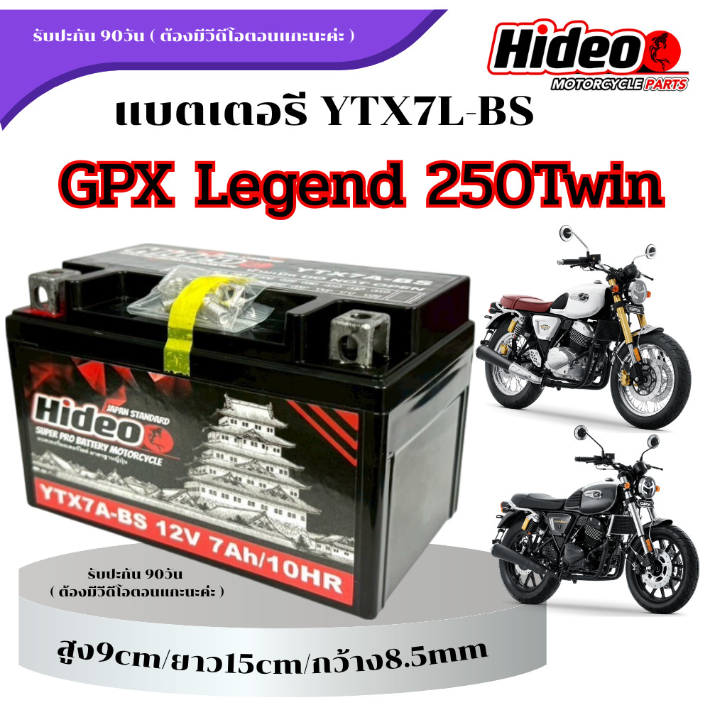 แบต GPX legend 250 twin กำลังไฟ12V 7Ah แบตมอเตอร์ไซค์ ลีเจ้น 250 ทวิน แบตHideo YTX7A-BS มาตรฐานญี่ปุ่น แบตใหม่ไฟแรง