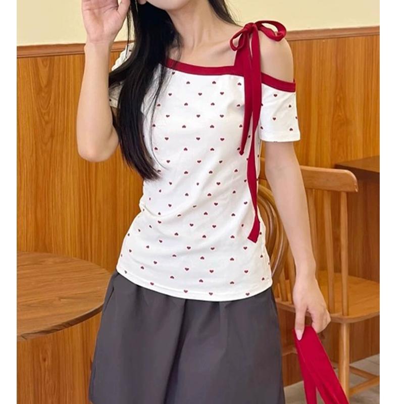 BIMI ขนาด S-2XL เสื้อปาดไหล่ผู้หญิง ลายจุด สไตล์เกาหลี ดีไซน์สุดคลาสสิก แขนสั้นเสื้อยืด สายรัด ฤดูร้อน ทุกโอกาส