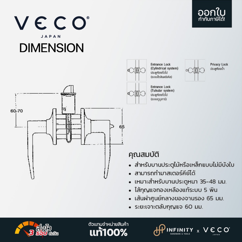 VECO ลูกบิดประตูก้านโยก (ทรงเขาควาย) สีสแตนเลส ห้องทั่วไป, ห้องน้ำ รุ่น 6414 SS