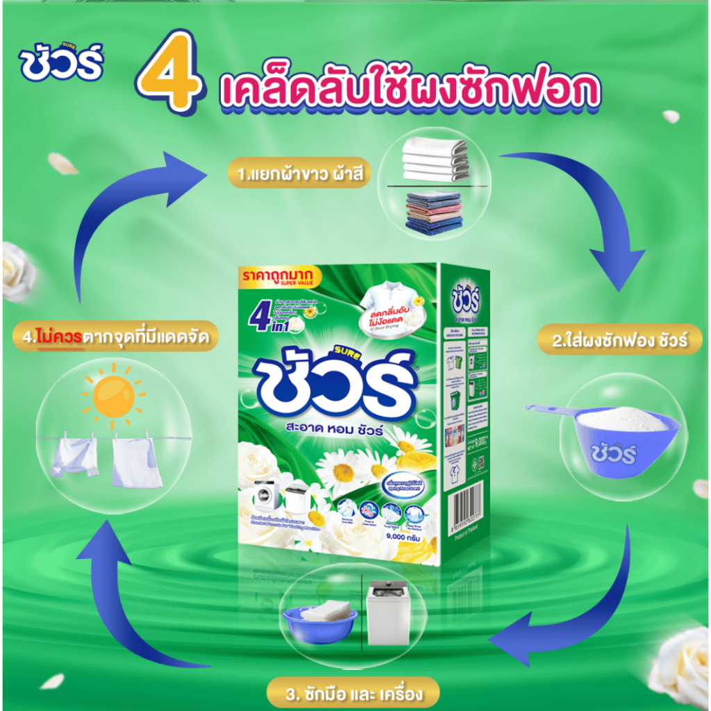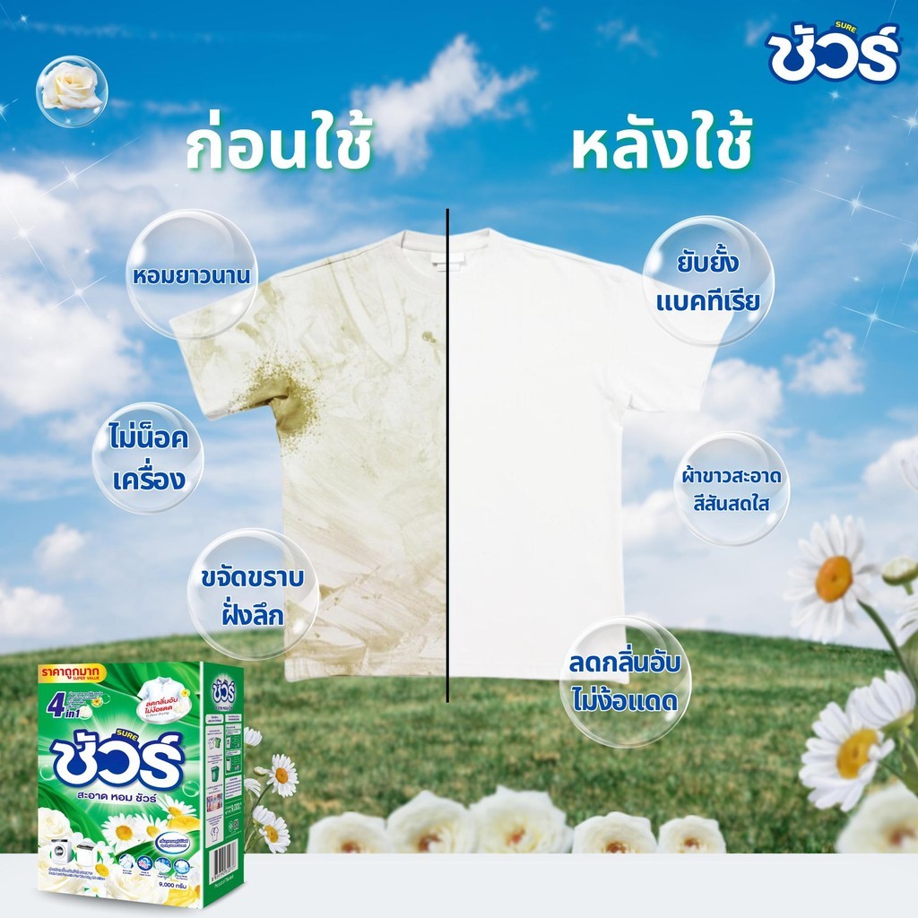 SURE 4 in 1 ผงซักฟอกชัวร์ 9KG พร้อมช้อน ถังผงซักฟอกถังใหญ่ สูตรเข้มข้น ซักผ้า